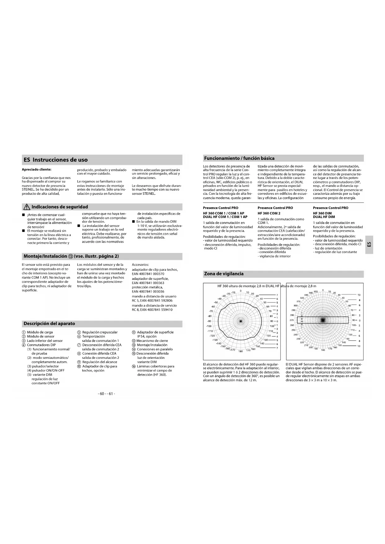 COM 2/DIM) corriente punta de conexión máx. 800 A/200 μs 30 × (1 × 18 W), 25 × (2 × 18 W) 25 × (1 × 36 W), 15 × (2 × 36 W) 20 × (1 × 58 W), 10 × (2 × 58 W) ¡ténganse en cuenta corrientes de conexión individuales de los reguladores electrónicos de tensión! Para mayores potencias de ruptura, será necesario anteponer un relé o contactor. Potencia, salida de conmutación 2 (sólo COM 2) (sólo HF 360) Presencia máx. 230 W/230 V máx. 1 A (cos ϕ = 1) para CEA (calefacción/extracción/aire acondicionado) Lugar de instalación en el interior de edificios Altura de montaje (montaje en el techo) altura del techo 2,5 m – 3,5 m Ángulo de detección HF 360 360° con ángulo de apertura de 140°, dado el caso, a través de cristal, madera y paredes de con- strucción ligera. Para la adaptación al interior, se pueden suprimir 1 ó 2 direcciones de detección. Dual HF véase diagrama pág. 61 dado el caso, a través de cristal, made- ra y paredes de construcción ligera. Alcance de detección HF 360 máx. Ø 12 m, regulación electrónica sin etapas Dual HF máx. 10 × 3 m en cualquier dirección, regulación electrónica sin etapas Salida de conmutación 1 Temporización 30 seg. – 30 min., modo impulso (aprox. 2 seg.) modo CI (adaptación automática al perfil de uso) Salida de conmutación 2 Temporización (sólo HF 360) sólo COM2 para CEA Conexión diferida 0 seg. a 10 min. Desconexión diferida 1 min. a 2 h vigilancia automática de interiores DIM: Temporización 30 seg. – 30 min. modo CI (adaptación automática al perfil de uso) Salida de mando 1 – 10 V / máx. 50 reguladores electrónicos de tensión, máx. 100 mA Sensores Alta frecuencia 5,8 GHz potencia de emisión aprox. < 1 mW Funciones vía conmutadores DIP DIP 1 funcionamiento normal/de prueba DIP 2 semiautomático/completamente autom. DIP 3 funcionamiento pulsadores/conectores DIP 4 pulsador ON/pulsador ON-OFF DIP 5 regulación de luz constante ON-OFF (DIM) Conexiones en paralelo maestro/esclavo maestro/maestro Ajuste confort Teach In (con mando a distancia opcional) Regulación de luminosidad 10 – 1000 lux, ∞/luz del día DIM 100 – 1000 lux Índice de protección IP 20 (IP 54 con AP Box) Clase de protección II Campo de temperatura -25 a +55 °C Carcasa resistente a la radiación UV, apto para lacados- 64 - - 65 - DIP 4 En la posición ON-OFF, la luz puede encender y apagarse ma