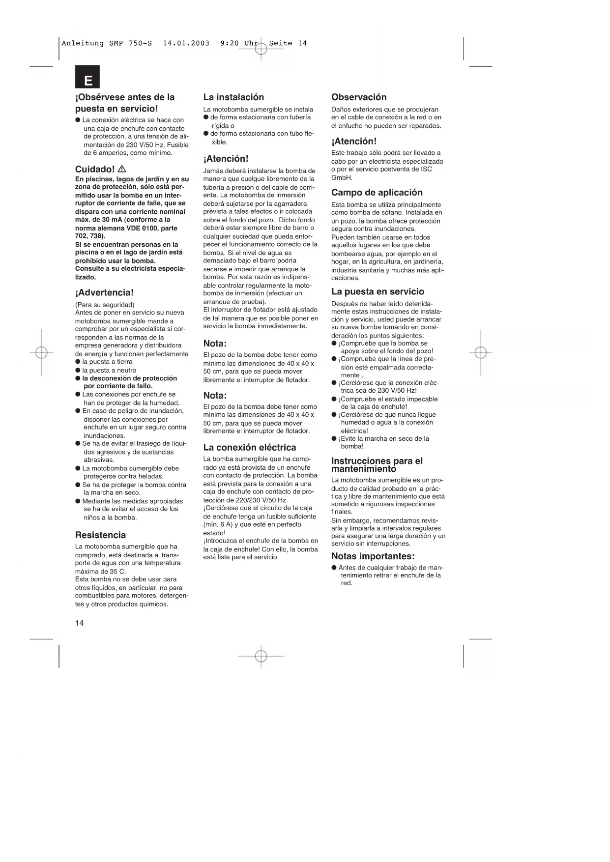 Netaansluiting 230 V ~ 50 Hz Opgenomen vermogen 750 Watt Capaciteit max. 13.500 l/h Opvoerhoogte max. 9 m Dompeldiepte max. 8 m Watertemperatuur max. 35° C Slangaansluiting 11/2” IG Vreemde voorwerpen tot Ø 35 mm Schakelpunthoogte: AAN 50 cm Schakelpunthoogte: UIT 5 cm Artikelnr. : 41.705.80 Technische gegevens Vermogensgegevens Opvoerhoogte Wateropbrengst SMP 750-S 2 m max.: 13.000 l/h 4 m max.: 9.800 l/h 6 m max.: 5.300 l/h Anleitung SMP 750-S 14.01.2003 9:20 Uhr Seite 1314 ¡Obsérvese antes de la puesta en servicio! ● La conexión eléctrica se hace con una caja de enchufe con contacto de protección, a una tensión de ali- mentación de 230 V/50 Hz. Fusible de 6 amperios, como mínimo. Cuidado! En piscinas, lagos de jardín y en su zona de protección, sólo está per- mitido usar la bomba en un inter- ruptor de corriente de falle, que se dispara con una corriente nominal máx. de 30 mA (conforme a la norma alemana VDE 0100, parte 702, 738). Si se encuentran personas en la piscina o en el lago de jardín está prohibido usar la bomba. Consulte a su electricista especia- lizado. ¡Advertencia! (Para su seguridad) Antes de poner en servicio su nueva motobomba sumergible mande a comprobar por un especialista si cor- responden a las normas de la empresa generadora y distribuidora de energía y funcionan perfectamente ● la puesta a tierra ● la puesta a neutro ● la desconexión de protección por corriente de fallo. ● Las conexiones por enchufe se han de proteger de la humedad. ● En caso de peligro de inundación, disponer las conexiones por enchufe en un lugar seguro contra inundaciones. ● Se ha de evitar el trasiego de líqui- dos agresivos y de sustancias abrasivas. ● La motobomba sumergible debe protegerse contra heladas. ● Se ha de proteger la bomba contra la marcha en seco. ● Mediante las medidas apropiadas se ha de evitar el acceso de los niños a la bomba. Resistencia La motobomba sumergible que ha comprado, está destinada al trans- porte de agua con una temperatura máxima de 35 C. Esta bomba no se debe usar para otros líquidos, en particular, no para combustibles para motores, detergen- tes y otros productos químicos. Observación Daños exteriores que se produjeran en el cable de conexión a la red o en el enfuche no pueden ser reparados. ¡Atención! Este trabajo sólo podrá ser llevado a cabo por un electricista especializado o por el servicio postventa de ISC GmbH. Campo de aplicación Esta bomba se utiliza principalmente como bomba de sótano. Instalada en un pozo, la bomba ofrece protección segura contra inundaciones. Pueden también usarse en todos aquellos lugares en los que debe bombearse agua, por ejemplo en el hogar, en la agricultura, en jardinería, industria sanitaria y muchas más apli- caciones. La puesta en servicio Después de haber leído detenida- mente estas instrucciones de instala- ción y servicio, usted puede arrancar su nueva bomba tomando en consi- deración los puntos siguientes: ● ¡Compruebe que la bomba se apoye sobre el fondo del pozo! ● ¡Compruebe que la línea de pre- sión esté empalmada correcta- mente . ● ¡Cerciórese que la conexión eléc- trica sea de 230 V/50 Hz! ● ¡Compruebe el estado impecable de la caja de enchufe! ● ¡Cerciórese de que nunca llegue humedad o agua a la conexión eléctrica! ● ¡Evite la marcha en seco de la bomba! Instrucciones para el mantenimiento La motobomba sumergible es un pro- ducto de calidad probado en la prác- tica y libre de mantenimiento que está sometido a rigurosas inspecciones finales. Sin embargo, recomendamos revis- arla y limpiarla a intervalos regulares para asegurar una larga duración y un servicio sin interrupciones. Notas importantes: ● Antes de cualquier trabajo de man- tenimiento retirar el enchufe de la red. La instalación La motobomba sumergible se instala ● de forma estacionaria con tubería rígida o ● de forma estacionaria con tubo fle- xible. ¡Atención! Jamás deberá instalarse la bomba de manera que cuelgue libremente de la tubería a presión o del cable de corri- ente. La motobomba de inmersión deberá sujetarse por la agarradera prevista a tales efectos o ir colocada sobre el fondo del pozo. Dicho fondo deberá estar siempre libre de barro o cualquier suciedad que pueda entor- pecer el funcionamiento correcto de la bomba. Si el nivel de agua es demasiado bajo el barro podría secarse e impedir que arranque la bomba. Por esta razón es indipens- able controlar regularmente la moto- bomba de inmersión (efectuar un arranque de prueba). El interruptor de flotador está ajustado de tal manera que es posible poner en servicio la bomba inmediatamente. Nota: El pozo de la bomba debe tener como mínimo las dimensiones de 40 x 40 x 50 cm, para que se pueda mover libremente el interruptor de flotador. Nota: El pozo de la bomba debe tener como mínimo las dimensiones de 40 x 40 x 50 cm, para que se pueda mover libremente el interruptor de flotador. La conexión eléctrica La bomba sumergible que ha comp- rado ya está provista de un enchufe con contacto de protección. La bomba está prevista para la conexión a una caja de enchufe con contacto de pro- tección de 220/230 V/50 Hz. ¡Cerciórese que el circuito de la caja de enchufe tenga un fusible suficiente (mín. 6 A) y que esté en perfecto estado! ¡Introduzca el enchufe de la bomba en la caja de enchufe! Con ello, la bomba está lista para el servicio.