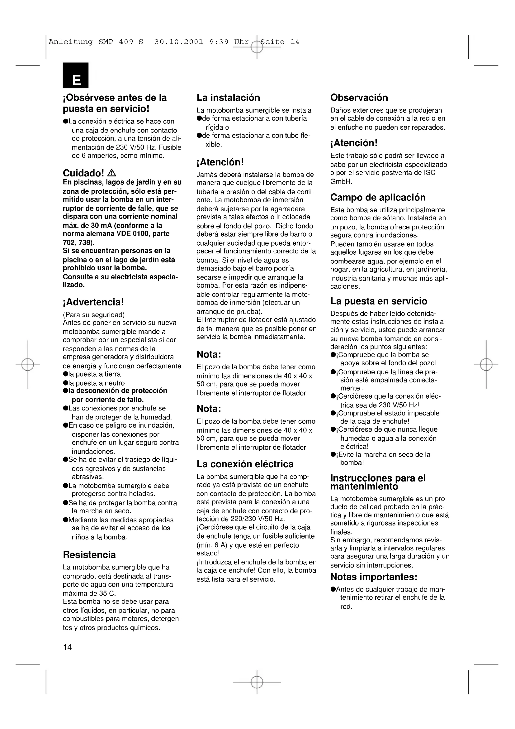 Netaansluiting 230 V ~ 50 Hz Opgenomen vermogen 400 Watt Capaciteit max. 9.000 l/h Opvoerhoogte max. 5 m Dompeldiepte max. 5 m Watertemperatuur max. 35° C Slangaansluiting 5/4” AG Vreemde voorwerpen tot Ø 20 mm Schakelpunthoogte: AAN 50 cm Schakelpunthoogte: UIT 5 cm Artikelnr. : 41.705.40 Technische gegevens Vermogensgegevens Opvoerhoogte Wateropbrengst SMP 409-S 2m max.: 7.000 l/h 3m max.: 5.500 l/h 4m max.: 3.000 l/h Anleitung SMP 409-S 30.10.2001 9:39 Uhr Seite 1314 ¡Obsérvese antes de la puesta en servicio! ● La conexión eléctrica se hace con una caja de enchufe con contacto de protección, a una tensión de ali- mentación de 230 V/50 Hz. Fusible de 6 amperios, como mínimo. Cuidado! En piscinas, lagos de jardín y en su zona de protección, sólo está per- mitido usar la bomba en un inter- ruptor de corriente de falle, que se dispara con una corriente nominal máx. de 30 mA (conforme a la norma alemana VDE 0100, parte 702, 738). Si se encuentran personas en la piscina o en el lago de jardín está prohibido usar la bomba. Consulte a su electricista especia- lizado. ¡Advertencia! (Para su seguridad) Antes de poner en servicio su nueva motobomba sumergible mande a comprobar por un especialista si cor- responden a las normas de la empresa generadora y distribuidora de energía y funcionan perfectamente ● la puesta a tierra ● la puesta a neutro ● la desconexión de protección por corriente de fallo. ● Las conexiones por enchufe se han de proteger de la humedad. ● En caso de peligro de inundación, disponer las conexiones por enchufe en un lugar seguro contra inundaciones. ● Se ha de evitar el trasiego de líqui- dos agresivos y de sustancias abrasivas. ● La motobomba sumergible debe protegerse contra heladas. ● Se ha de proteger la bomba contra la marcha en seco. ● Mediante las medidas apropiadas se ha de evitar el acceso de los niños a la bomba. Resistencia La motobomba sumergible que ha comprado, está destinada al trans- porte de agua con una temperatura máxima de 35 C. Esta bomba no se debe usar para otros líquidos, en particular, no para combustibles para motores, detergen- tes y otros productos químicos. Observación Daños exteriores que se produjeran en el cable de conexión a la red o en el enfuche no pueden ser reparados. ¡Atención! Este trabajo sólo podrá ser llevado a cabo por un electricista especializado o por el servicio postventa de ISC GmbH. Campo de aplicación Esta bomba se utiliza principalmente como bomba de sótano. Instalada en un pozo, la bomba ofrece protección segura contra inundaciones. Pueden también usarse en todos aquellos lugares en los que debe bombearse agua, por ejemplo en el hogar, en la agricultura, en jardinería, industria sanitaria y muchas más apli- caciones. La puesta en servicio Después de haber leído detenida- mente estas instrucciones de instala- ción y servicio, usted puede arrancar su nueva bomba tomando en consi- deración los puntos siguientes: ● ¡Compruebe que la bomba se apoye sobre el fondo del pozo! ● ¡Compruebe que la línea de pre- sión esté empalmada correcta- mente . ● ¡Cerciórese que la conexión eléc- trica sea de 230 V/50 Hz! ● ¡Compruebe el estado impecable de la caja de enchufe! ● ¡Cerciórese de que nunca llegue humedad o agua a la conexión eléctrica! ● ¡Evite la marcha en seco de la bomba! Instrucciones para el mantenimiento La motobomba sumergible es un pro- ducto de calidad probado en la prác- tica y libre de mantenimiento que está sometido a rigurosas inspecciones finales. Sin embargo, recomendamos revis- arla y limpiarla a intervalos regulares para asegurar una larga duración y un servicio sin interrupciones. Notas importantes: ● Antes de cualquier trabajo de man- tenimiento retirar el enchufe de la red. La instalación La motobomba sumergible se instala ● de forma estacionaria con tubería rígida o ● de forma estacionaria con tubo fle- xible. ¡Atención! Jamás deberá instalarse la bomba de manera que cuelgue libremente de la tubería a presión o del cable de corri- ente. La motobomba de inmersión deberá sujetarse por la agarradera prevista a tales efectos o ir colocada sobre el fondo del pozo. Dicho fondo deberá estar siempre libre de barro o cualquier suciedad que pueda entor- pecer el funcionamiento correcto de la bomba. Si el nivel de agua es demasiado bajo el barro podría secarse e impedir que arranque la bomba. Por esta razón es indipens- able controlar regularmente la moto- bomba de inmersión (efectuar un arranque de prueba). El interruptor de flotador está ajustado de tal manera que es posible poner en servicio la bomba inmediatamente. Nota: El pozo de la bomba debe tener como mínimo las dimensiones de 40 x 40 x 50 cm, para que se pueda mover libremente el interruptor de flotador. Nota: El pozo de la bomba debe tener como mínimo las dimensiones de 40 x 40 x 50 cm, para que se pueda mover libremente el interruptor de flotador. La conexión eléctrica La bomba sumergible que ha comp- rado ya está provista de un enchufe con contacto de protección. La bomba está prevista para la conexión a una caja de enchufe con contacto de pro- tección de 220/230 V/50 Hz. ¡Cerciórese que el circuito de la caja de enchufe tenga un fusible suficiente (mín. 6 A) y que esté en perfecto estado! ¡Introduzca el enchufe de la bomba en la caja de enchufe! Con ello, la bomba está lista para el servicio.