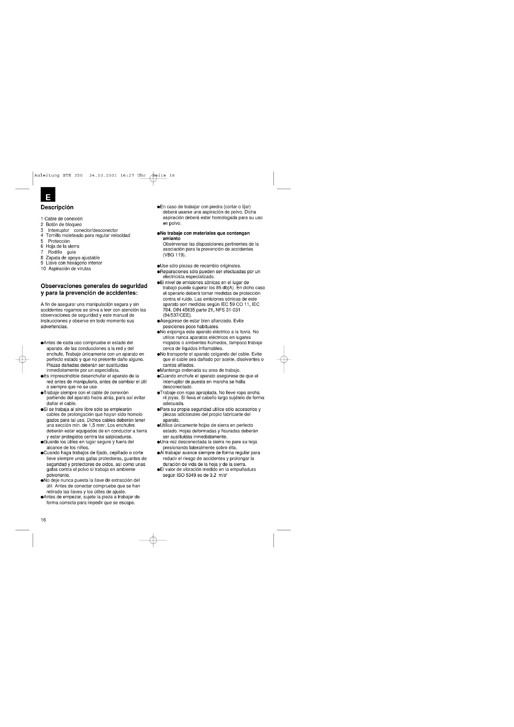 voren schuiven tegenstuk Anleitung STE 350 24.10.2001 16:27 Uhr Seite 1516 Descripción 1 Cable de conexión 2 Botón de bloqueo 3 Interruptor conector/desconector 4 Tornillo moleteado para regular velocidad 5 Protección 6 Hoja de la sierra 7 Rodillo guía 8 Zapata de apoyo ajustable 9 Llave con hexagono interior 10 Aspiración de virutas Observaciones generales de seguridad y para la prevención de accidentes: A fin de asegurar una manipulación segura y sin accidentes rogamos se sirva a leer con atención las observaciones de seguridad y este manual de instrucciones y observe en todo momento sus advertencias. Antes de cada uso compruebe el estado del aparato, de las conducciones a la red y del enchufe. Trabaje únicamente con un aparato en perfecto estado y que no presente daño alguno. Piezas dañadas deberán ser sustituidas inmediatamente por un especialista. Es imprescindible desenchufar el aparato de la red antes de manipularlo, antes de cambiar el útil o siempre que no se use. Trabaje siempre con el cable de conexión partiendo del aparato hacia atrás, para así evitar dañar el cable. Si se trabaja al aire libre sólo se emplearán cables de prolongación que hayan sido homolo gados para tal uso. Dichos cables deberán tener una sección min. de 1,5 mm