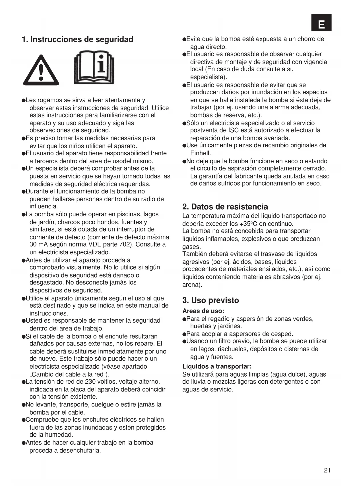 Les rogamos se sirva a leer atentamente y observar estas instrucciones de seguridad. Utilice estas instrucciones para familiarizarse con el aparato y su uso adecuado y siga las observaciones de seguridad. Es preciso tomar las medidas necesarias para evitar que los niños utilicen el aparato. El usuario del aparato tiene responsabilidad frente a terceros dentro del area de usodel mismo. Un especialista deberá comprobar antes de la puesta en servicio que se hayan tomado todas las medidas de seguridad eléctrica requeridas. Durante el funcionamiento de la bomba no pueden hallarse personas dentro de su radio de influencia. La bomba sólo puede operar en piscinas, lagos de jardín, charcos poco hondos, fuentes y similares, si está dotada de un interruptor de corriente de defecto (corriente de defecto máxima 30 mA según norma VDE parte 702). Consulte a un electricista especializado. Antes de utilizar el aparato proceda a comprobarlo visualmente. No lo utilice si algún dispositivo de seguridad está dañado o desgastado. No desconecte jamás los dispositivos de seguridad. Utilice el aparato únicamente según el uso al que está destinado y que se indica en este manual de instrucciones. Usted es responsable de mantener la seguridad dentro del area de trabajo. Si el cable de la bomba o el enchufe resultaran dañados por causas externas, no los repare. El cable deberá sustituirse inmediatamente por uno de nuevo. Este trabajo sólo puede hacerlo un electricista especializado (véase apartado „Cambio del cable a la red“). La tensión de red de 230 voltios, voltaje alterno, indicada en la placa del aparato deberá coincidir con la tensión existente. No levante, transporte, cuelgue o estire jamás la bomba por el cable. Compruebe que los enchufes eléctricos se hallen fuera de las zonas inundadas y estén protegidos de la humedad. Antes de hacer cualquier trabajo en la bomba proceda a desenchufarla. Evite que la bomba esté expuesta a un chorro de agua directo. El usuario es responsable de observar cualquier directiva de montaje y de seguridad con vigencia local (En caso de duda consulte a su especialista). El usuario es responsable de evitar que se produzcan daños por inundación en los espacios en que se halla instalada la bomba si ésta deja de trabajar (por ej. usando una alarma adecuada, bombas de reserva, etc.). Sólo un electricista especializado o el servicio postventa de ISC está autorizado a efectuar la reparación de una bomba averiada. Use únicamente piezas de recambio originales de Einhell. No deje que la bomba funcione en seco o estando el circuito de aspiración completamente cerrado. La garantía del fabricante queda anulada en caso de daños sufridos por funcionamiento en seco.