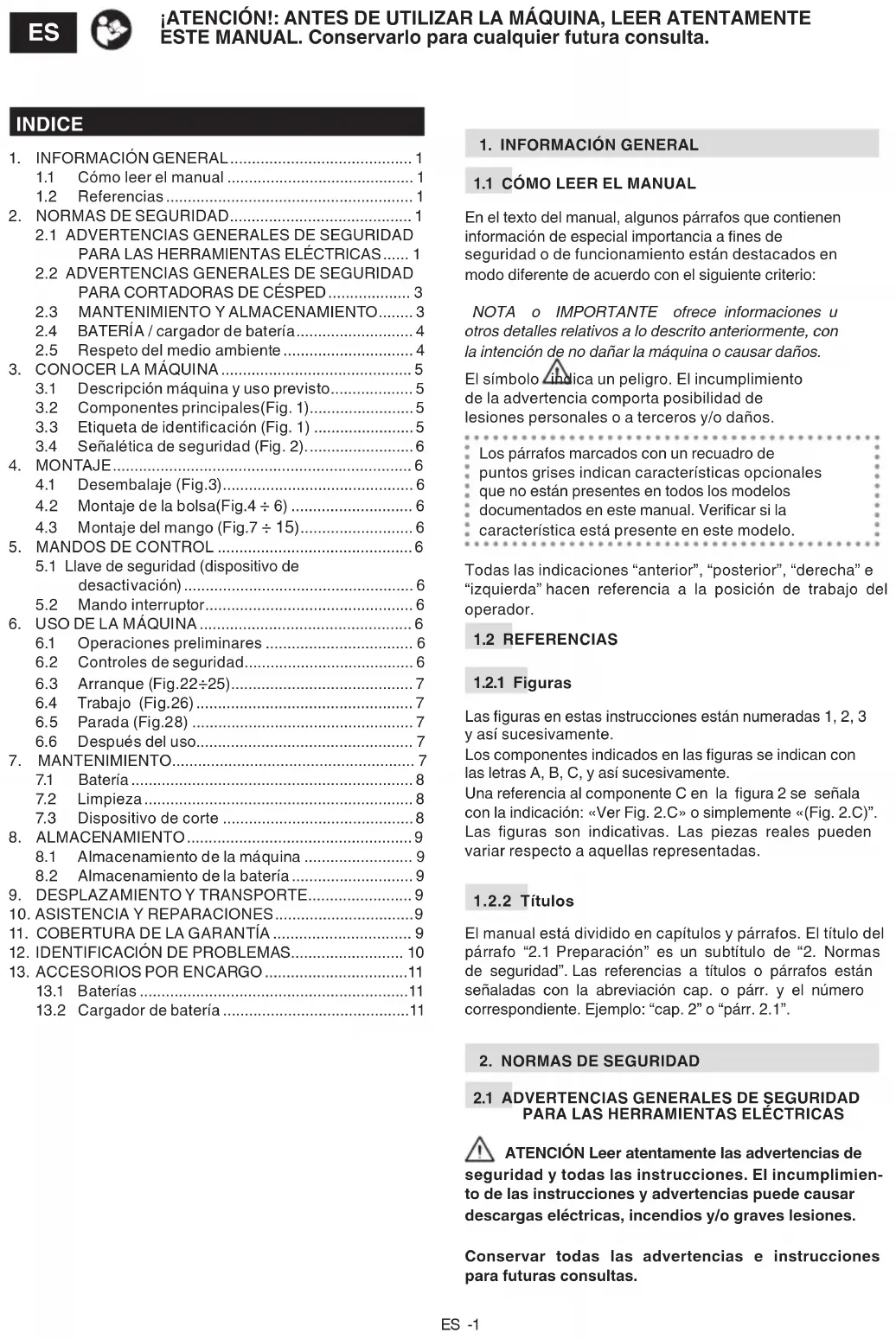 Device used to recharge the battery (Fig. 36).ES -1 ¡ATENCIÓN!: ANTES DE UTILIZAR LA MÁQUINA, LEER ATENTAMENTE ESTE MANUAL. Conservarlo para cualquier futura consulta.