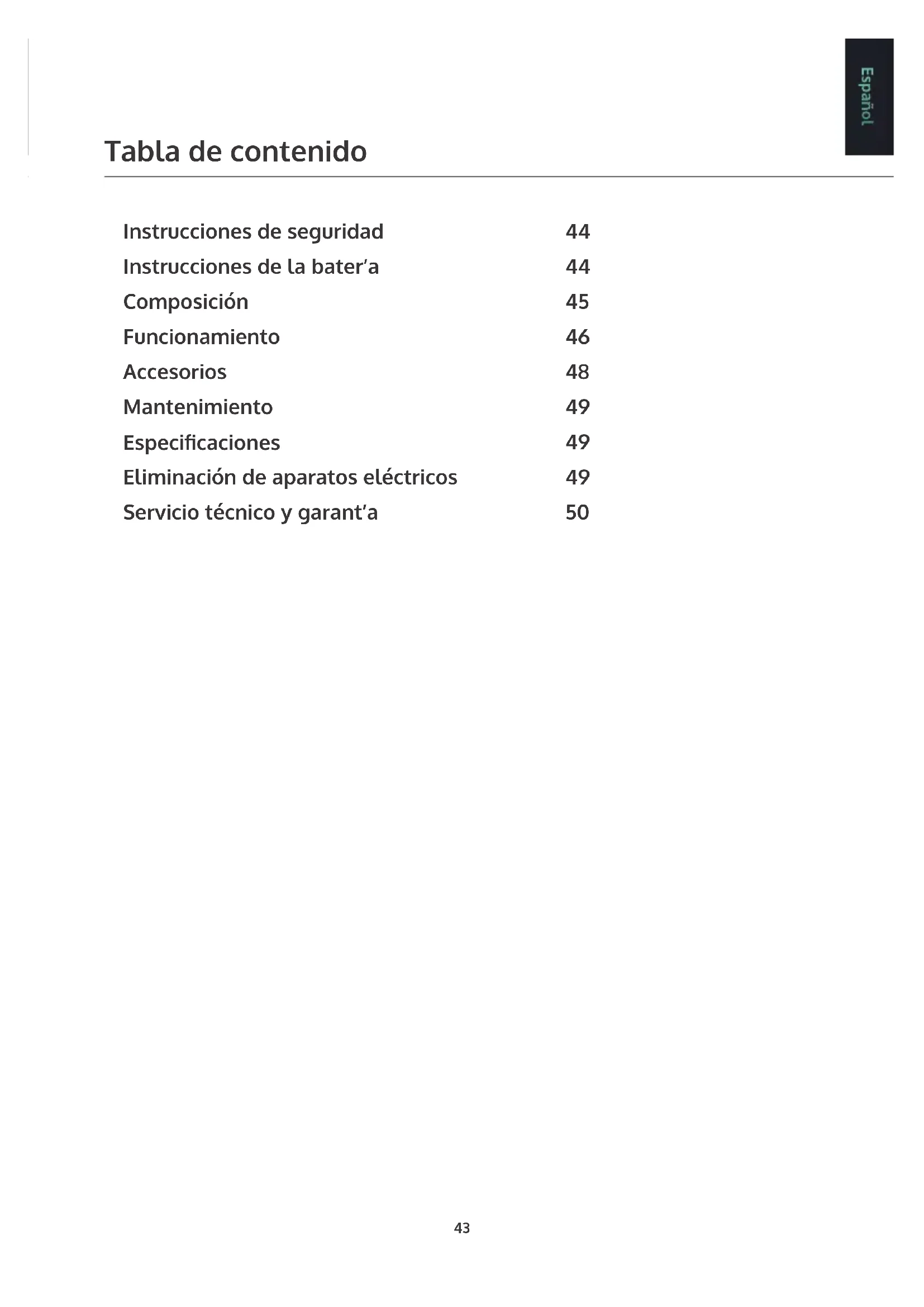 - No aspire sustancias inamables o explosivas como la gasolina o el alcohol. Este aparato incluye baterías de Li-ion, no las exponga a altas temperaturas, ya que pueden explotar. En el caso improbable de que se produzca una fuga, no toque el líquido.Si el líquido entra en contacto con la piel, lávese inmediatamente con agua y jabón. Si el líquido entra en los ojos, lávelos inmediatamente con agua limpia durante al menos 10 minutos y busque atención médica. Use guantes para manipular la batería y deséchela inmediatamente de acuerdo con los reglamentos locales. Evite el contacto entre la batería y pequeños objetos metálicos como clips, monedas, llaves, clavos o tornillos. Antes de usar una batería nueva o de usar la batería por primera vez después de mucho tiempo, cargue completamente la batería. Cuando el dispositivo se guarde y no se utilice durante largos períodos de tiempo, asegúrese de que la batería esté completamente cargada.45 Español Composición