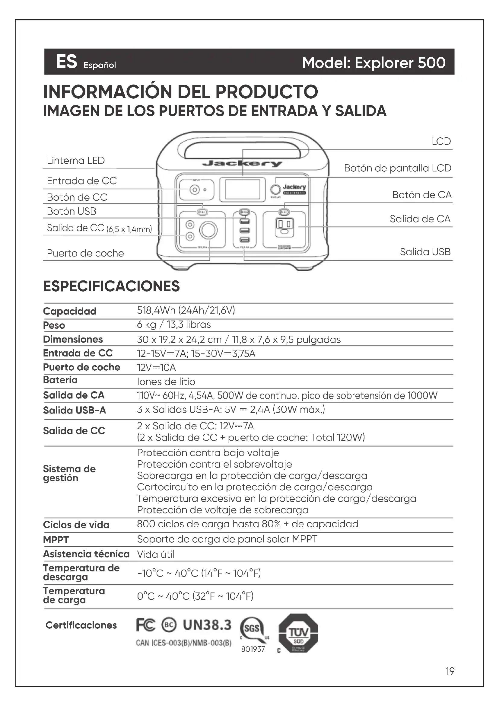 camping-car/tente/cabine hors réseau/...). N'utilisez en aucun cas ce produit en extérieur (par exemple : endroit exposé à la pluie ou à la neige, utilisation dans des environnements humides, au bord de la mer ou d'un cours d'eau).INFORMACIÓN DEL PRODUCTO IMAGEN DE LOS PUERTOS DE ENTRADA Y SALIDA ESPECIFICACIONES Botón de pantalla LCD Linterna LED LCD Entrada de CC Salida de CA Salida USB Botón de CA Botón USB Botón de CC Puerto de coche Salida de CC (6,5 x 1,4mm) Capacidad Peso Dimensiones Entrada de CC Puerto de coche Batería Salida de CA Ciclos de vida MPPT Asistencia técnica 518,4Wh (24Ah/21,6V) 6 kg / 13,3 libras 30 x 19,2 x 24,2 cm / 11,8 x 7,6 x 9,5 pulgadas 12-15V⎓7A; 15-30V⎓3,75A 12V⎓10A Iones de litio 110V~ 60Hz, 4,54A, 500W de continuo, pico de sobretensión de 1000W Salida USB-A Salida de CC Sistema de gestión Temperatura de descarga Temperatura de carga Certificaciones 0°C ~ 40°C (32°F ~ 104°F) -10°C ~ 40°C (14°F ~ 104°F) Vida útil Soporte de carga de panel solar MPPT 800 ciclos de carga hasta 80% + de capacidad Protección contra bajo voltaje Protección contra el sobrevoltaje Sobrecarga en la protección de carga/descarga Cortocircuito en la protección de carga/descarga Temperatura excesiva en la protección de carga/descarga Protección de voltaje de sobrecarga 3 x Salidas USB-A: 5V ⎓ 2,4A (30W máx.) 2 x Salida de CC: 12V⎓7A (2 x Salida de CC + puerto de coche: Total 120W)