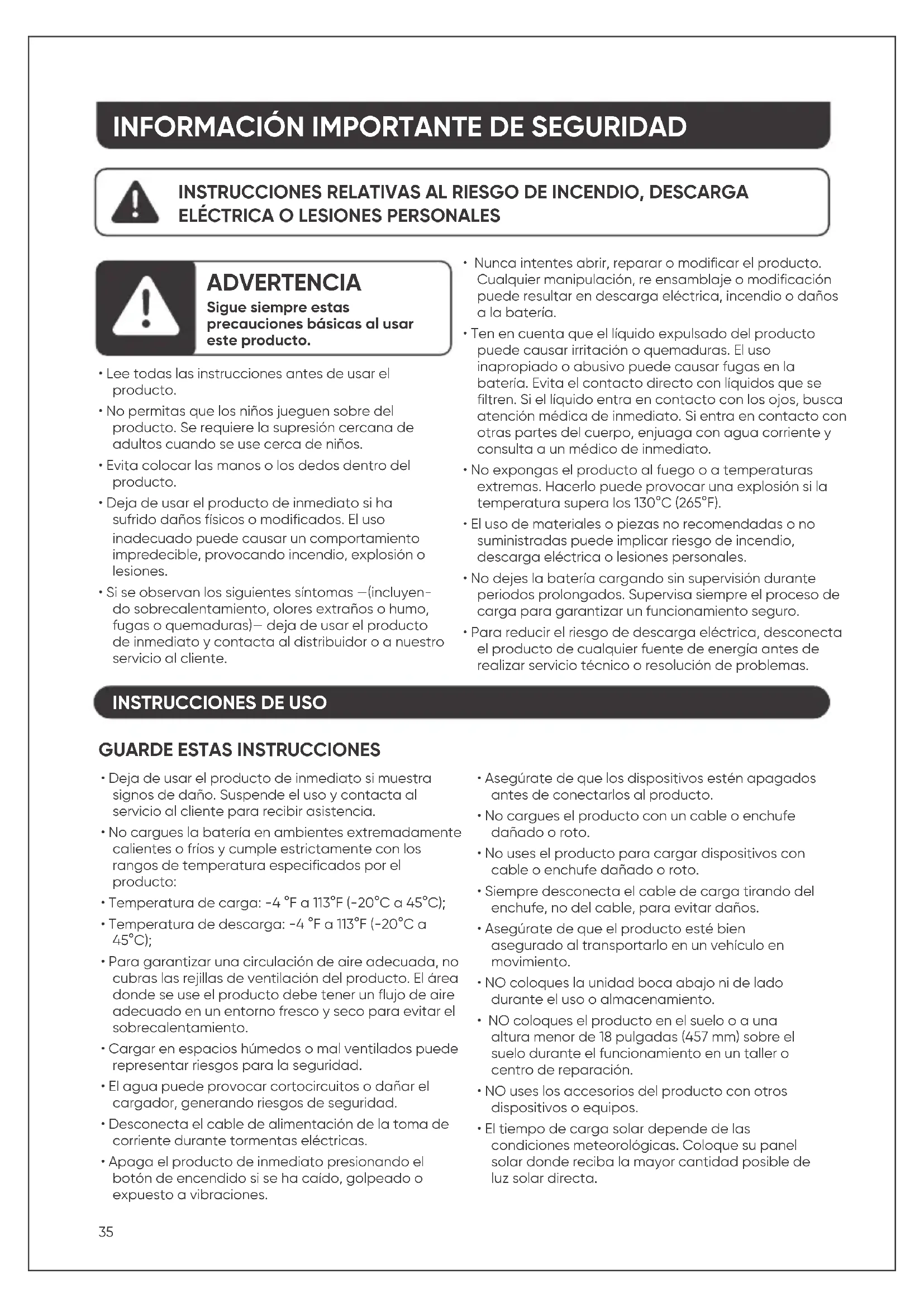 - El tiempo de carga solar depende de las condiciones meteorológicas. Coloque su panel solar donde reciba la mayor cantidad posible de luz solar directa. INSTRUCCIONES RELATIVAS AL RIESGO DE INCENDIO, DESCARGA