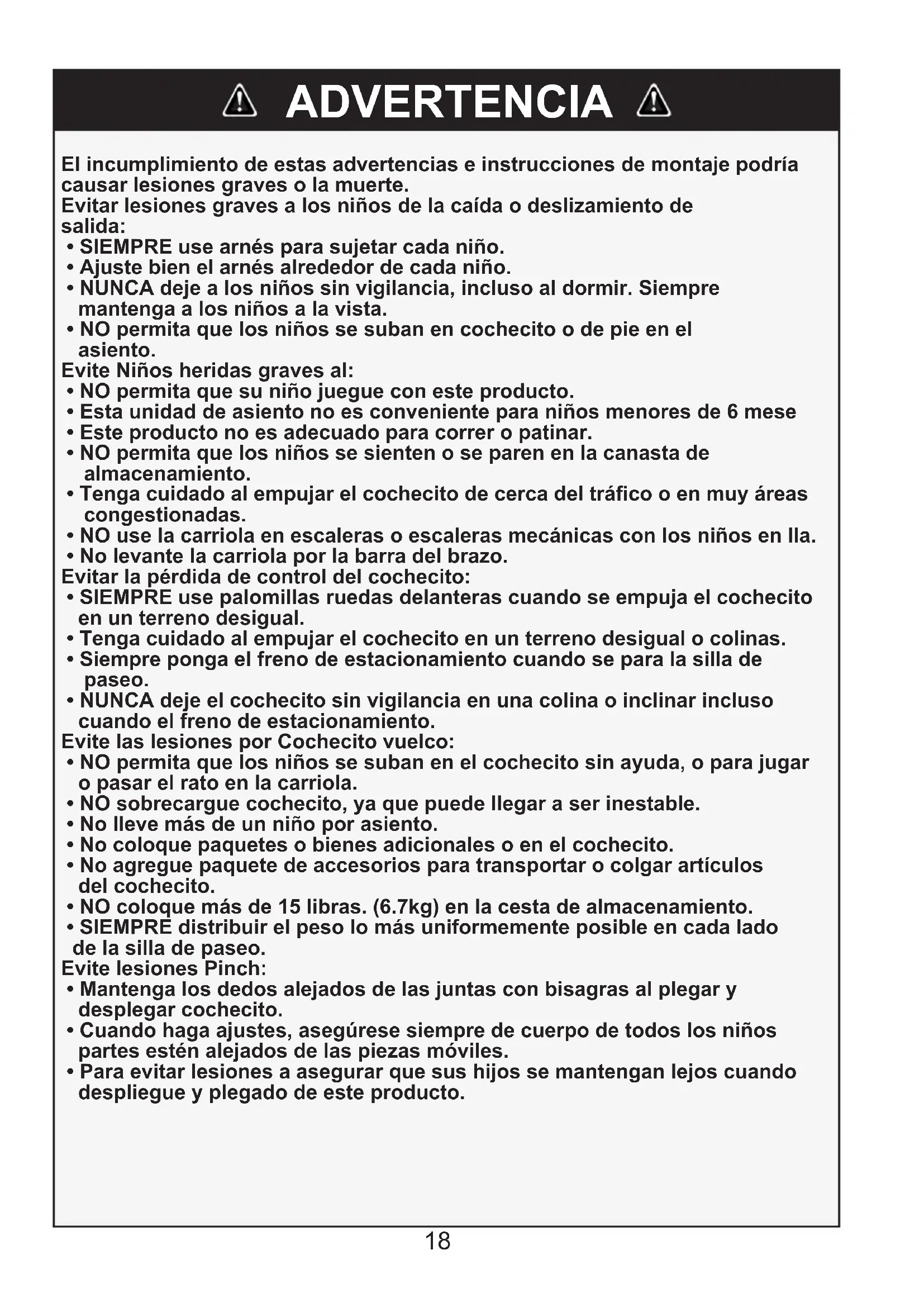 - SIEMPRE distribuir el peso lo más uniformemente posible en cada lado de la silla de paseo. Evite lesiones Pinch:
