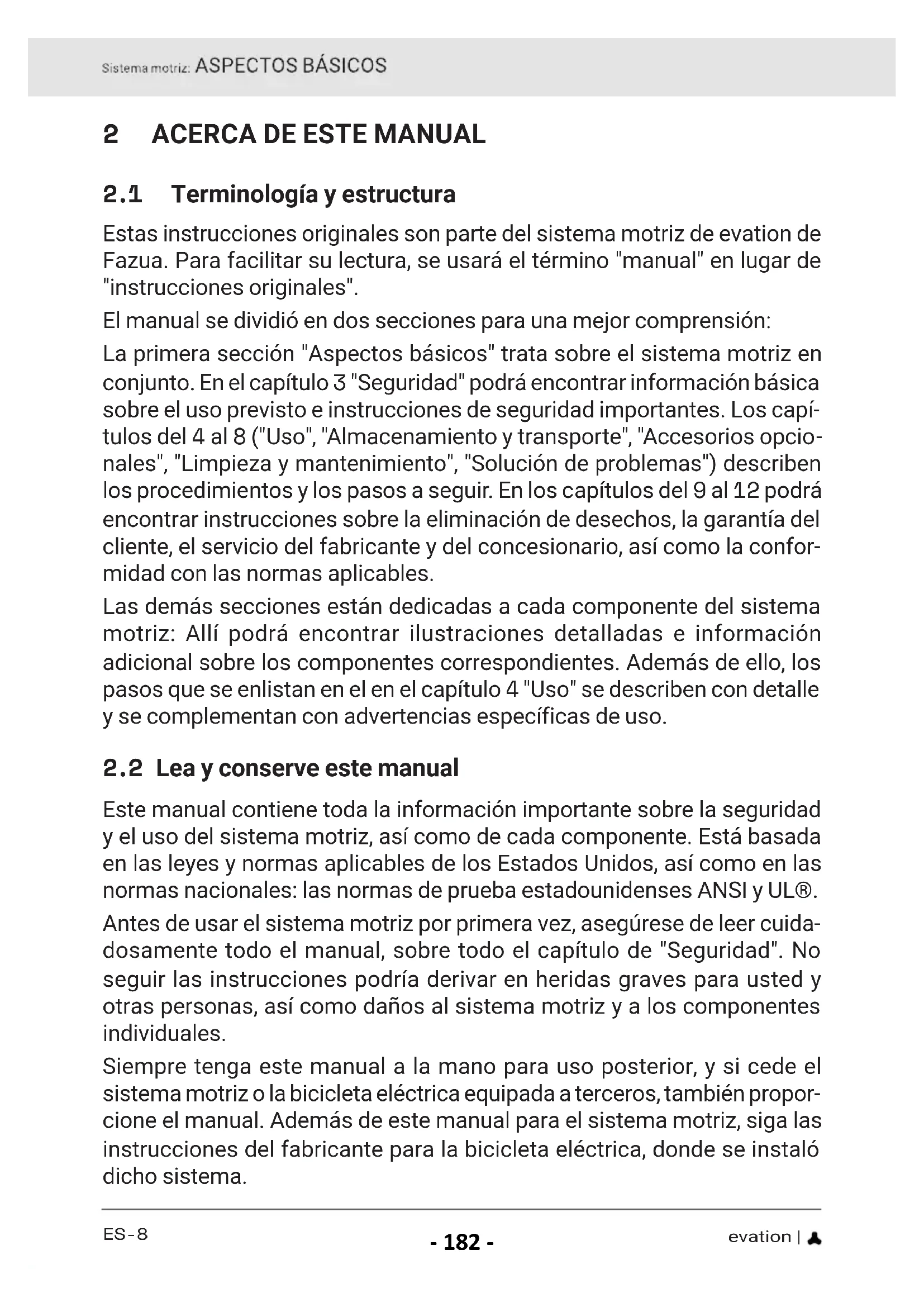 Este manual contiene toda la información importante sobre la seguridad y el uso del sistema motriz, así como de cada componente. Está basada en las leyes y normas aplicables de los Estados Unidos, así como en las normas nacionales: las normas de prueba estadounidenses ANSI y UL®. Antes de usar el sistema motriz por primera vez, asegúrese de leer cuida- dosamente todo el manual, sobre todo el capítulo de "Seguridad". No seguir las instrucciones podría derivar en heridas graves para usted y otras personas, así como daños al sistema motriz y a los componentes individuales. Siempre tenga este manual a la mano para uso posterior, y si cede el sistema motriz o la bicicleta eléctrica equipada a terceros, también propor- cione el manual. Además de este manual para el sistema motriz, siga las instrucciones del fabricante para la bicicleta eléctrica, donde se instaló dicho sistema. FAZUA Original_Instrucion_ES_MX.indb 8FAZUA Original_Instrucion_ES_MX.indb 8 28-Feb-20 13:56:3028-Feb-20 13:56:30 - 182 -ES-9 | evation La marca denominativa Bluetooth® y los logotipos son marcas regis- tradas de Bluetooth SIG, Inc., y Fazua hace uso de estas bajo licencia. Este manual no se puede reproducir, modificar, distribuir ni utilizar de ninguna forma, ni total ni parcialmente, sin el permiso previo por escrito.
