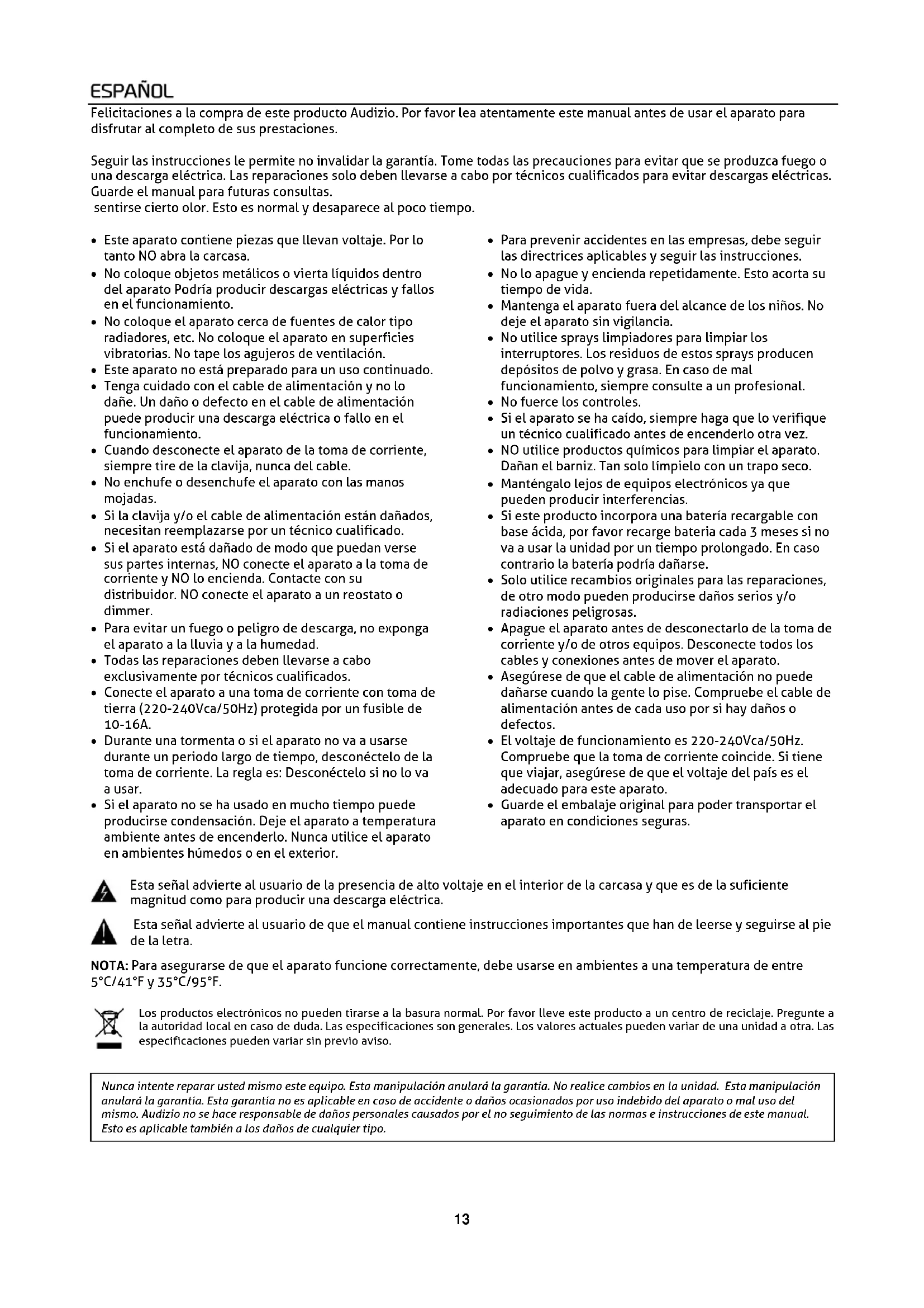 - Guarde el embalaje original para poder transportar el aparato en condiciones seguras. Esta señal advierte al usuario de la presencia de alto voltaje en el interior de la carcasa y que es de la suficiente magnitud como para producir una descarga eléctrica. Esta señal advierte al usuario de que el manual contiene instrucciones importantes que han de leerse y seguirse al pie de la letra. NOTA: Para asegurarse de que el aparato funcione correctamente, debe usarse en ambientes a una temperatura de entre 5°C/41°F y 35°C/95°F. Los productos electrónicos no pueden tirarse a la basura normal. Por favor lleve este producto a un centro de reciclaje. Pregunte a la autoridad local en caso de duda. Las especificaciones son generales. Los valores actuales pueden variar de una unidad a otra. Las especificaciones pueden variar sin previo aviso.