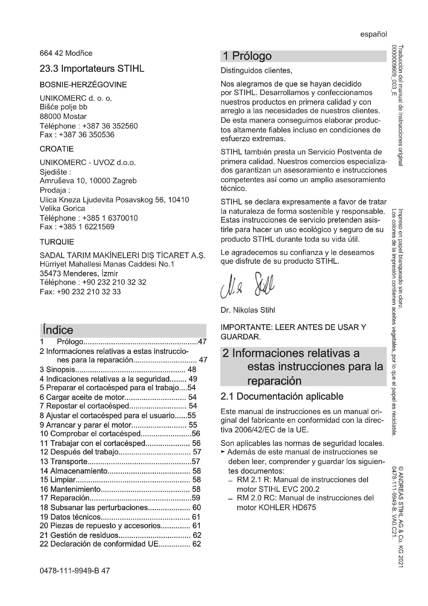 - 22 Declaración de conformidad UE 1 Prólogo Distinguidos clientes, Nos alegramos de que se hayan decidido por STIHL. Desarrollamos y confeccionamos nuestros productos en primera calidad y con arreglo a las necesidades de nuestros clientes. De esta manera conseguimos elaborar produc‐ tos altamente fiables incluso en condiciones de esfuerzo extremas. STIHL también presta un Servicio Postventa de primera calidad. Nuestros comercios especializa‐ dos garantizan un asesoramiento e instrucciones competentes así como un amplio asesoramiento técnico. STIHL se declara expresamente a favor de tratar la naturaleza de forma sostenible y responsable. Estas instrucciones de servicio pretenden asis‐ tirle para hacer un uso ecológico y seguro de su producto STIHL durante toda su vida útil. Le agradecemos su confianza y le deseamos que disfrute de su producto STIHL. Dr. Nikolas Stihl p. 62