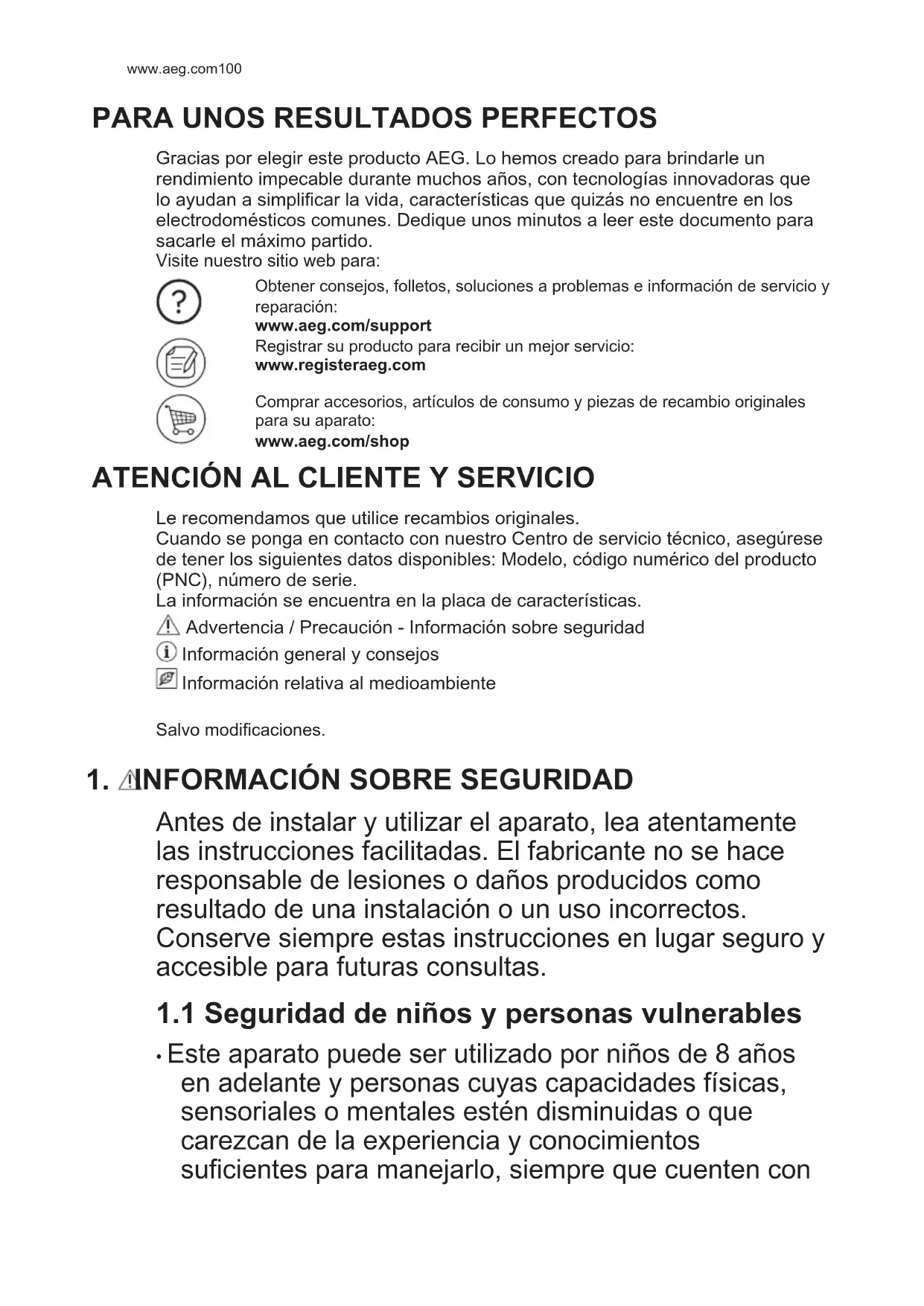 Gracias por elegir este producto AEG. Lo hemos creado para brindarle un rendimiento impecable durante muchos años, con tecnologías innovadoras que lo ayudan a simplificar la vida, características que quizás no encuentre en los electrodomésticos comunes. Dedique unos minutos a leer este documento para sacarle el máximo partido. Visite nuestro sitio web para: Obtener consejos, folletos, soluciones a problemas e información de servicio y reparación: www.aeg.com/support Registrar su producto para recibir un mejor servicio: www.registeraeg.com Comprar accesorios, artículos de consumo y piezas de recambio originales para su aparato: www.aeg.com/shop
