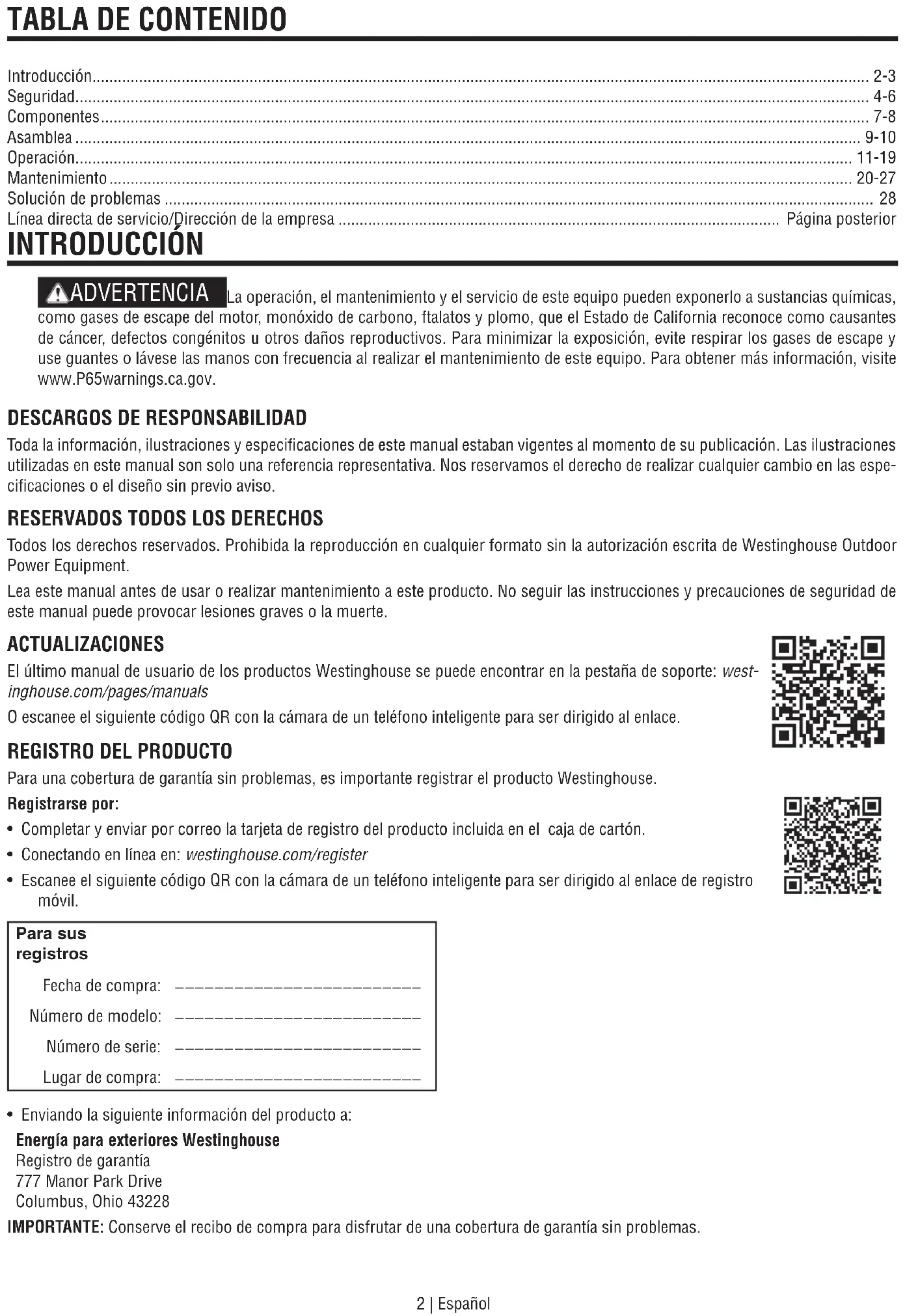 Todos los derechos reservados. Prohibida la reproducción en cualquier formato sin la autorización escrita de Westinghouse Outdoor Power Equipment. Lea este manual antes de usar o realizar mantenimiento a este producto. No seguir las instrucciones y precauciones de seguridad de este manual puede provocar lesiones graves o la muerte. ACTUALIZACIONES El último manual de usuario de los productos Westinghouse se puede encontrar en la pestaña de soporte: west- inghouse.com/pages/manuals O escanee el siguiente código QR con la cámara de un teléfono inteligente para ser dirigido al enlace.