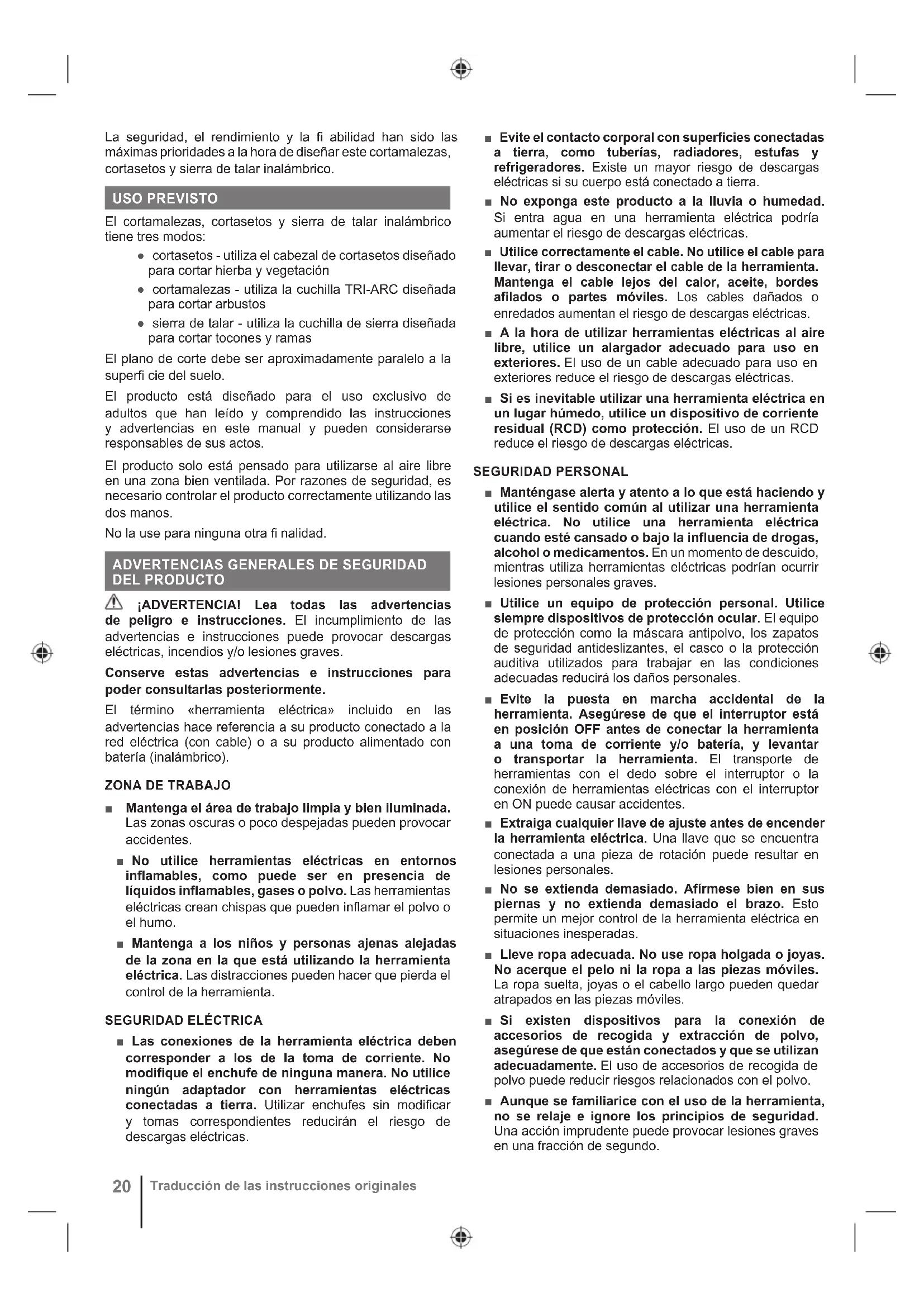 ■ Antes de su uso y después de algún golpe, compruebe que no hay piezas dañadas. Los interruptores defectuosos o cualquier otra pieza dañada o gastada deben ser sustituidos o reparados adecuadamente por un establecimiento de servicio autorizado. ■ La pequeña cuchilla colocada en la protección de seguridad está diseñada para recortar la nueva línea ampliada en la longitud correcta para un rendimiento seguro y óptimo. La cuchilla está muy afilada. No toque la cuchilla, especialmente, cuando limpie el producto. ■ Utilice sólo el hilo de corte de recambio del fabricante. No utilice ningún tipo de pieza cortante. ■ Asegúrese de que el accesorio de corte está correctamente instalado y ajustado. ■ Nunca use el producto excepto si todas las protecciones, deflectores y mangos están unidos de forma correcta y segura. ■ Asegúrese de que la cuchilla de corte de línea de la protección de seguridad esté correctamente colocada y fijada antes de cada uso. ■ Mantenga el accesorio del cabezal por debajo de la cintura. ■ Apague inmediatamente la unidad y retire la batería en caso de accidente o avería. No vuelva a utilizar el producto hasta que un servicio de mantenimiento autorizado lo haya inspeccionado completamente. ■ Para reducir el riesgo de lesión asociado con el contacto con las piezas móviles, apague siempre el producto, extraiga la batería y deje que ambos se enfríen. Asegúrese de que todas las partes móviles se han detenido por completo: ● antes del mantenimiento ● antes de limpiar una obstrucción ● antes de inspeccionar, limpiar o trabajar con el producto ● antes de cambiar los accesorios ● después de golpear un objeto extraño ● cuando deje el aparato desatendido ● siempre que se lleve a cabo el mantenimiento ● si el producto empieza a vibrar de forma anormal ■ Asegúrese de que todas las protecciones y mangos están bien ajustados y en buenas condiciones. ■ Sujete el producto por los mangos destinados al efecto y limite el tiempo de funcionamiento y de exposición. ■ Tenga cuidado con los objetos lanzados por el medio de corte. Elimine cualquier residuo, como piedras pequeñas, grava y otros objetos extraños del área de trabajo antes de iniciar el funcionamiento del producto. Los alambres o las cuerdas pueden enredarse en las líneas de corte. ■ El producto cuenta con un arnés. Utilice el arnés durante el funcionamiento del producto. Ajuste con cuidado el arnés para que pueda soportar el peso del producto cómodamente en la parte trasera derecha. Identifique el mecanismo de liberación rápida y practique utilizándolo antes de empezar a usar la máquina. Su uso correcto puede evitar lesiones graves en caso de emergencia. Nunca lleve ropa adicional sobre el arnés ni dificulte el acceso al mecanismo de extracción rápida. ■ No utilice varias correas o arneses para los hombros. ■ Asegúrese siempre de que las aberturas de ventilación estén libres de residuos. ■ Utilice el producto únicamente a temperaturas comprendidas entre 0 °C y 40 °C. ■ Guarde el producto en un lugar donde la temperatura ambiente esté comprendida entre 0 °C y 40 °C. ■ Utilice guantes de trabajo resistentes a la hora de instalar o quitar las cuchillas, ya que tienen bordes afilados. ■ No intente tocar o detener la cuchilla durante la rotación. ■ Sustituya cualquier cuchilla dañada. Compruebe siempre si la lámina está correctamente colocada y sujeta de forma segura antes de cada utilización. ■ Use únicamente la cuchilla de sustitución del fabricante. No utilice ningún tipo de pieza cortante. ■ Nunca corte ningún material de más de 13 mm de diámetro con la cuchilla TRI-ARC. ■ No corte nunca ningún material de más de 40 mm de diámetro con la hoja de sierra. Tenga cuidado con la caída de las ramas cuando utilice la hoja de sierra. ■ Cubra la cuchilla con el protector antes de almacenar el producto o durante su transporte. Retire siempre la protección de la cuchilla antes de utilizar la unidad. Se no se retirase la protección de la cuchilla, ésta podría salir despedida cuando la cuchilla comience a girar. ■ A la hora de instalar o sustituir la batería, deposite el producto en el suelo con la cuchilla mirando hacia arriba para evitar que la cuchilla entre en contacto con el suelo y prolongar así su vida útil. ■ Para cortar de forma fácil y segura acérquese a las hierbas que corta de derecha a izquierda. En caso de que se encuentre con un objeto inesperado o material leñoso esto podría minimizar el contragolpe de la cuchilla. Para controlar este aparato deben utilizarse ambas manos. ■ El uso prolongado de una herramienta puede causar o agravar lesiones. Si utiliza el producto durante periodos de tiempo prolongados, asegúrese de realizar pausas de forma periódica. ADVERTENCIAS DE SEGURIDAD DE LA BATERÍA ADICIONAL ■ Para reducir el riesgo de incendio, lesiones personales y daños al producto provocados por un cortocircuito, nunca sumerja el producto, la batería o el cargador en líquido, ni permita que un líquido fluya por su interior. Los fluidos corrosivos o conductivos, como el agua de mar, ciertos productos quími-cos industriales y blanqueadores o lejías que contienen, etc., Pueden causar un cortocircuito. ■ Cargue la batería en un lugar donde la temperatura ambiente esté comprendida entre 10 °C y 38 °C. ■ Guarde la batería en un lugar donde la temperatura ambiente esté comprendida entre 0 °C y 20°C. ■ Utilice la batería en un lugar donde la temperatura ambiente esté comprendida entre 0 °C y 40 °C.24 Traducción de las instrucciones originales
