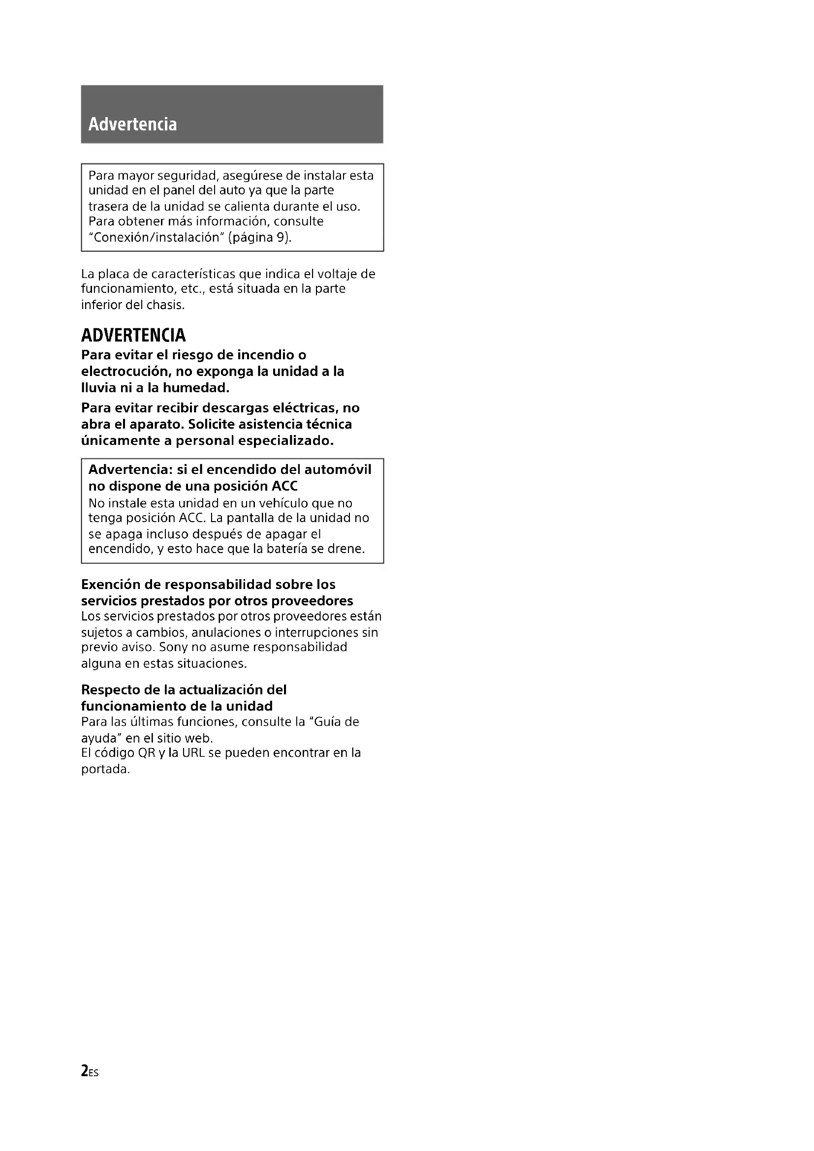 pondre aux questions concernant le contenu du code source.2ES La placa de características que indica el voltaje de funcionamiento, etc., está situada en la parte inferior del chasis. ADVERTENCIA Para evitar el riesgo de incendio o electrocución, no exponga la unidad a la lluvia ni a la humedad. Para evitar recibir descargas eléctricas, no abra el aparato. Solicite asistencia técnica únicamente a personal especializado. Exención de responsabilidad sobre los servicios prestados por otros proveedores Los servicios prestados por otros proveedores están sujetos a cambios, anulaciones o interrupciones sin previo aviso. Sony no asume responsabilidad alguna en estas situaciones. Respecto de la actualización del funcionamiento de la unidad Para las últimas funciones, consulte la “Guía de ayuda” en el sitio web. El código QR y la URL se pueden encontrar en la portada. Advertencia Para mayor seguridad, asegúrese de instalar esta unidad en el panel del auto ya que la parte trasera de la unidad se calienta durante el uso. Para obtener más información, consulte “Conexión/instalación” (página 9). Advertencia: si el encendido del automóvil no dispone de una posición ACC No instale esta unidad en un vehículo que no tenga posición ACC. La pantalla de la unidad no se apaga incluso después de apagar el encendido, y esto hace que la batería se drene.3ES Precaución EN NINGÚN CASO SONY PODRÁ SER CONSIDERADO RESPONSABLE POR CUALQUIER DAÑO CASUAL, INDIRECTO O CONSECUENTE, NI POR OTROS DAÑOS INCLUIDO, PERO SIN LIMITARSE A, LA PÉRDIDA DE BENEFICIOS, LA PÉRDIDA DE INGRESOS, LA PÉRDIDA DE DATOS, LA PÉRDIDA DE USO DEL PRODUCTO NI DE CUALQUIER MATERIAL ASOCIADO, EL TIEMPO DE