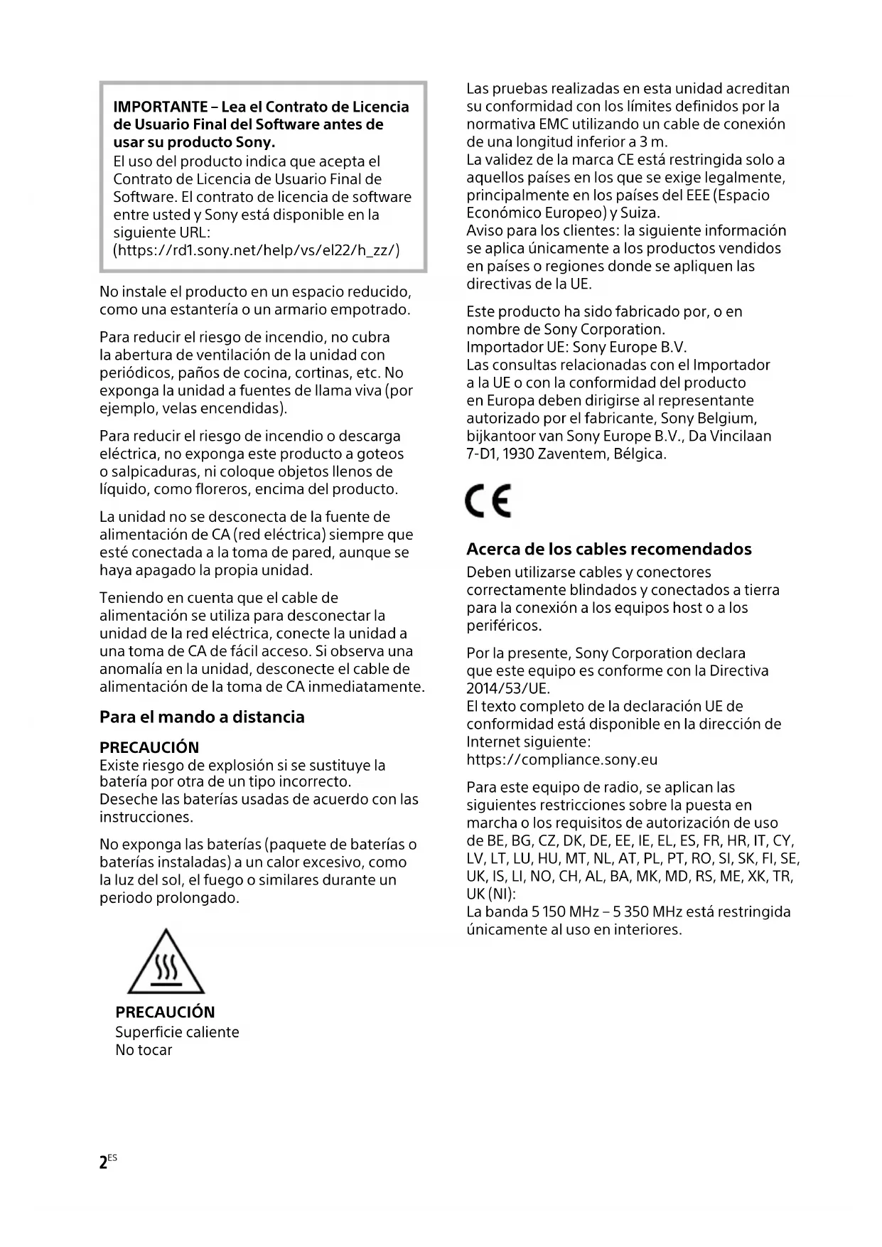 TA-AN1000 5-037-028-43(1) IMPORTANTE – Lea el Contrato de Licencia de Usuario Final del Software antes de usar su producto Sony. El uso del producto indica que acepta el Contrato de Licencia de Usuario Final de Software. El contrato de licencia de software entre usted y Sony está disponible en la siguiente URL: (https://rd1.sony.net/help/vs/el22/h_zz/) No instale el producto en un espacio reducido, como una estantería o un armario empotrado. Para reducir el riesgo de incendio, no cubra la abertura de ventilación de la unidad con periódicos, paños de cocina, cortinas, etc. No exponga la unidad a fuentes de llama viva (por ejemplo, velas encendidas). Para reducir el riesgo de incendio o descarga eléctrica, no exponga este producto a goteos o salpicaduras, ni coloque objetos llenos de líquido, como floreros, encima del producto. La unidad no se desconecta de la fuente de alimentación de CA (red eléctrica) siempre que esté conectada a la toma de pared, aunque se haya apagado la propia unidad. Teniendo en cuenta que el cable de alimentación se utiliza para desconectar la unidad de la red eléctrica, conecte la unidad a una toma de CA de fácil acceso. Si observa una anomalía en la unidad, desconecte el cable de alimentación de la toma de CA inmediatamente. Para el mando a distancia PRECAUCIÓN Existe riesgo de explosión si se sustituye la batería por otra de un tipo incorrecto. Deseche las baterías usadas de acuerdo con las instrucciones. No exponga las baterías (paquete de baterías o baterías instaladas) a un calor excesivo, como la luz del sol, el fuego o similares durante un periodo prolongado. PRECAUCIÓN Superficie caliente No tocar Las pruebas realizadas en esta unidad acreditan su conformidad con los límites definidos por la normativa EMC utilizando un cable de conexión de una longitud inferior a 3 m. La validez de la marca CE está restringida solo a aquellos países en los que se exige legalmente, principalmente en los países del EEE (Espacio Económico Europeo) y Suiza. Aviso para los clientes: la siguiente información se aplica únicamente a los productos vendidos en países o regiones donde se apliquen las directivas de la UE. Este producto ha sido fabricado por, o en nombre de Sony Corporation. Importador UE: Sony Europe B.V. Las consultas relacionadas con el Importador a la UE o con la conformidad del producto en Europa deben dirigirse al representante autorizado por el fabricante, Sony Belgium, bijkantoor van Sony Europe B.V., Da Vincilaan 7-D1, 1930 Zaventem, Bélgica. Acerca de los cables recomendados Deben utilizarse cables y conectores correctamente blindados y conectados a tierra para la conexión a los equipos host o a los periféricos. Por la presente, Sony Corporation declara que este equipo es conforme con la Directiva 2014/53/UE. El texto completo de la declaración UE de conformidad está disponible en la dirección de Internet siguiente: https://compliance.sony.eu Para este equipo de radio, se aplican las siguientes restricciones sobre la puesta en marcha o los requisitos de autorización de uso de BE, BG, CZ, DK, DE, EE, IE, EL, ES, FR, HR, IT, CY, LV, LT, LU, HU, MT, NL, AT, PL, PT, RO, SI, SK, FI, SE, UK, IS, LI, NO, CH, AL, BA, MK, MD, RS, ME, XK, TR, UK (NI): La banda 5 150 MHz – 5 350 MHz está restringida únicamente al uso en interiores.3