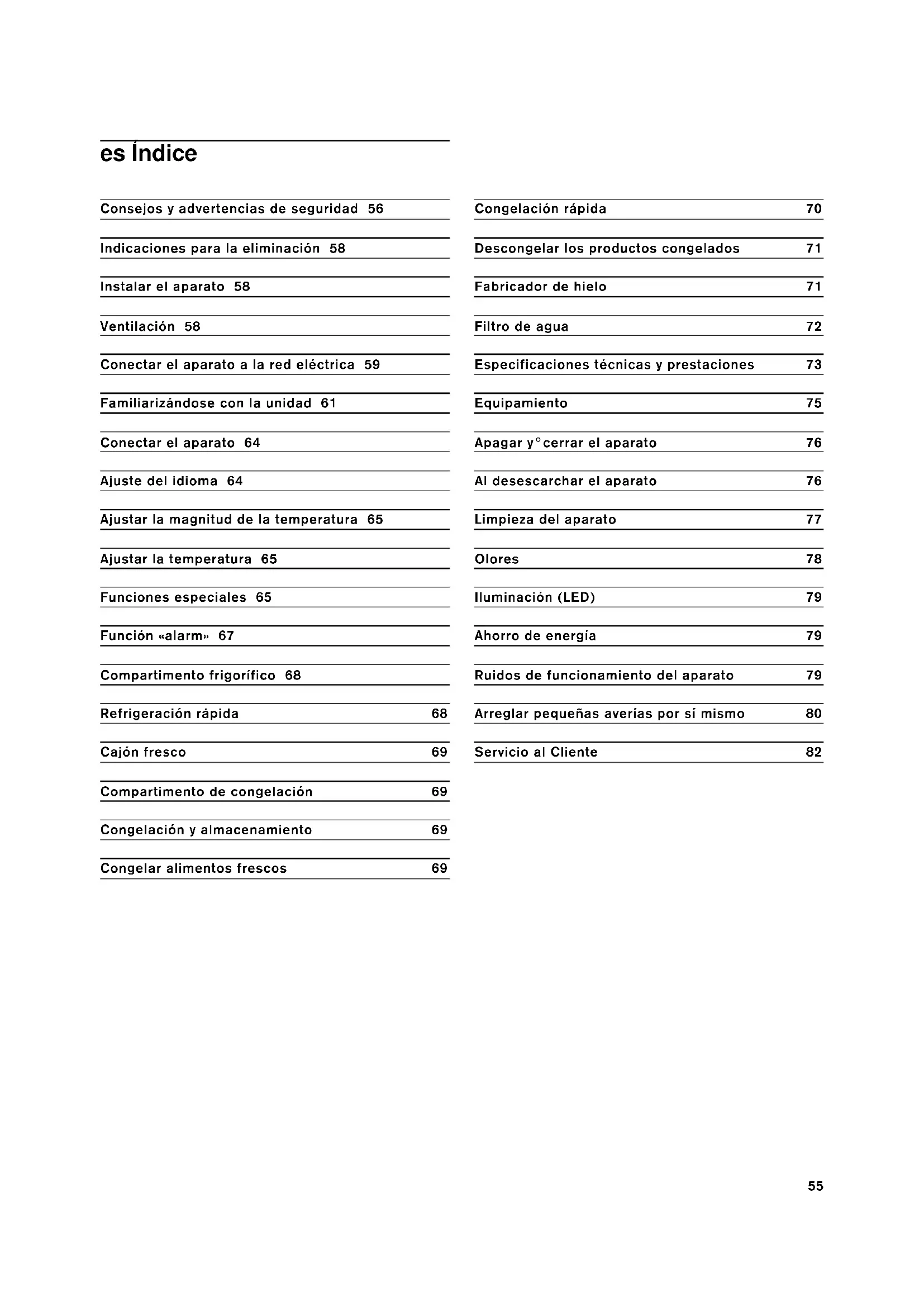 AVISO: No almacenar sustancia explosivas en este equipo. ¡Existe peligro de explosión! 9 ATENCION: No volver a congelar los alimentos que se hayan descongelado o empezado a descongelarse. Cocer o asar los alimentos antes de congelarlos. Nunca conservar los alimentos congelados por un tiempo de almacenamiento mayor al máximo permitido. Usos del compartimento de congelación ▯ Para guardar los alimentos congelados. ▯ Para fabricar cubos de hielo. ▯ Para congelar alimentos frescos. Nota: ¡Asegúrese de que la puerta del compartimento de congelación esté siempre cerrada! Con la puerta abierta, los productos congelados se descongelan y el compartimento de congelación se cubre de hielo en gran medida. Además: ¡hay desperdicio de energía por el elevado consumo de energía eléctrica! Congelación y almacenamiento Al comprar alimentos congelados ▯ El envase no debe estar dañado. ▯ Se debe tener en cuenta la fecha de caducidad. ▯ La temperatura del mostrador de ventas debe estar a 0 °F (–18 °C) o más fría. ▯ De ser posible, transportar los alimentos congelados en una bolsa isotérmica y colocarlos rápidamente en el compartimiento de congelación. Congelar alimentos frescos Para congelar utilice únicamente alimentos frescos y en perfectas condiciones. Para mantener el valor nutricional, sabor y color de las verduras tanto como sea posible, deben escaldarse antes de su congelación. Las berenjenas, los pimientos, las calabazas y los espárragos no hay que escaldarlos. La literatura sobre congelación y escaldado la encuentra en las librerías. Nota: Procurar que los alimentos congelados que ya hubiera en el congelador no entren en contacto con los alimentos frescos que se desean congelar. ▯ Alimentos adecuados para la congelación: Pan y bollos, pescado y marisco, carne, caza, aves, verduras y hortalizas, frutas, hierbas aromáticas, huevos sin cáscara, productos lácteos tales como queso, mantequilla, platos cocinados y restos de comidas como sopas, potajes, carnes o pescados cocinados, platos de papas, guisos y platos dulces. ▯ Alimentos que no deben congelarse: Verduras que se consumen normalmente crudas, como lechugas o rábanos, huevos con cáscara, uvas, manzanas enteras, peras y melocotones, huevos duros, yogurt, leche agria, crema agria, crema fresca y mayonesa.70 Embalar los productos congelados Envasar los alimentos herméticamente para que no se deshidraten o pierdan su sabor.