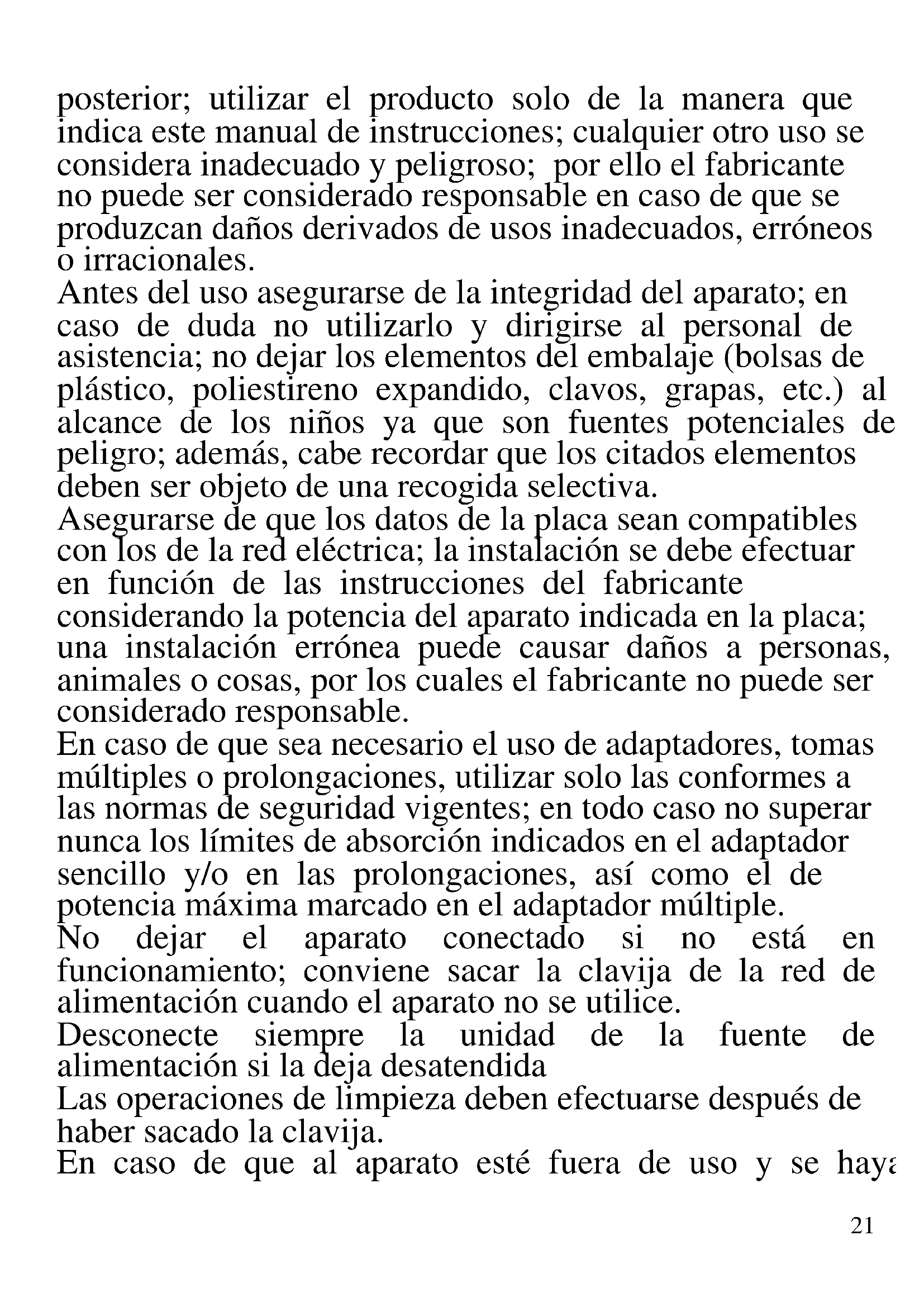 A continuación se presentan importantes indicaciones sobre la instalación, el uso y el mantenimiento. Conservar con cuidado este manual para cualquier consulta21 posterior; utilizar el producto solo de la manera que indica este manual de instrucciones; cualquier otro uso se considera inadecuado y peligroso; por ello el fabricante no puede ser considerado responsable en caso de que se produzcan daños derivados de usos inadecuados, erróneos o irracionales. Antes del uso asegurarse de la integridad del aparato; en caso de duda no utilizarlo y dirigirse al personal de asistencia; no dejar los elementos del embalaje (bolsas de plástico, poliestireno expandido, clavos, grapas, etc.) al alcance de los niños ya que son fuentes potenciales de peligro; además, cabe recordar que los citados elementos deben ser objeto de una recogida selectiva. Asegurarse de que los datos de la placa sean compatibles con los de la red eléctrica; la instalación se debe efectuar en función de las instrucciones del fabricante considerando la potencia del aparato indicada en la placa; una instalación errónea puede causar daños a personas, animales o cosas, por los cuales el fabricante no puede ser considerado responsable. En caso de que sea necesario el uso de adaptadores, tomas múltiples o prolongaciones, utilizar solo las conformes a las normas de seguridad vigentes; en todo caso no superar nunca los límites de absorción indicados en el adaptador sencillo y/o en las prolongaciones, así como el de potencia máxima marcado en el adaptador múltiple. No dejar el aparato conectado si no está en funcionamiento; conviene sacar la clavija de la red de alimentación cuando el aparato no se utilice. Desconecte siempre la unidad de la fuente de alimentación si la deja desatendida Las operaciones de limpieza deben efectuarse después de haber sacado la clavija. En caso de que al aparato esté fuera de uso y se haya22 decidido no repararlo, se recomienda inutilizarlo cortando el cable de alimentación. - No acercar el cable de alimentación a objetos cortantes o a superficies calientes y no tirar del mismo para sacar la clavija. No deje que cuelgue de la superficie de trabajo donde un niño pueda sostenerla. No utilizar el producto en caso de daños en el cable de alimentación, en la clavija o en caso de cortocircuitos; llevar a reparar el producto por parte de un centro de asistencia autorizado. - No exponer el producto a condiciones atmosféricas adversas como lluvia, humedad, hielo, etc. Conservarlo en lugares secos. No manejar o tocar el producto con las manos húmedas o los pies descalzos. - Este aparato puede ser utilizado por niños a partir de 8 años y por personas con capacidades físicas, sensoriales o mentales reducidas o con falta de experiencia o conocimiento si a dichas personas se ha asegurado una supervisión adecuada o bien si han recibido instrucciones sobre el uso seguro del aparato; las operaciones de limpieza y de mantenimiento no deben ser efectuadas por niños a no ser que tengan más de 8 años y estén supervisados. - Los niños no deben jugar con el aparato. - Mantener el producto y el cable fuera del alcance de los niños menores de 8 años. Si el cable de alimentación está dañado, o en caso de una falla y/o mal funcionamiento, no manipule el aparato. Cualquier reparación debe ser realizada por el fabricante o por su servicio de asistencia técnica o, en cualquier caso, por una persona con una calificación similar, a fin de evitar cualquier riesgo. El incumplimiento de lo anterior puede comprometer la seguridad del dispositivo e invalidar los términos de la garantía. ATENCIÓN: el producto tiene una función de calentamiento. Las superficies pueden desarrollar altas23 temperaturas. La percepción de la temperatura es distinta para cada persona, utilizar el aparato con cautela. Tocar solo las superficies diseñadas para ser tocadas. Este aparato está diseñado para uso doméstico o similares: cocinas para el personal de tiendas, oficinas u otros centros de trabajo, para clientes de hoteles, moteles, hostales y similares. Utilice únicamente piezas de repuesto y accesorios originales. No someta el producto a impactos fuertes se producirán daños serios. Antes de cada uso, desenrolle el cable de alimentación. El aparato no está diseñado para su uso a través de temporizadores externos o mandos a distancia.