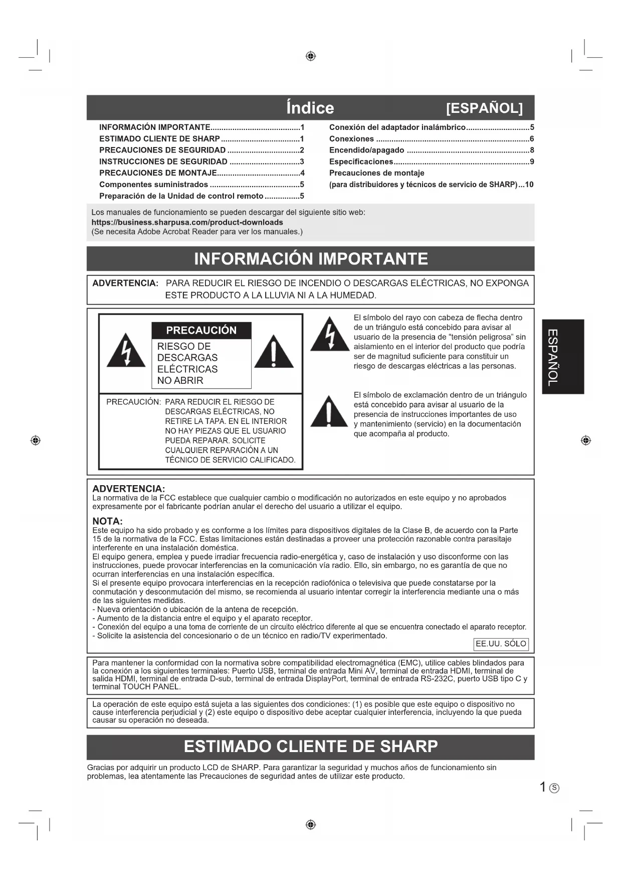 Conexión del equipo a una toma de corriente de un circuito eléctrico diferente al que se encuentra conectado el aparato receptor. - Solicite la asistencia del concesionario o de un técnico en radio/TV experimentado.EE.UU. SÓLOLos manuales de funcionamiento se pueden descargar del siguiente sitio web:https://business.sharpusa.com/product-downloads(Se necesita Adobe Acrobat Reader para ver los manuales.)2
