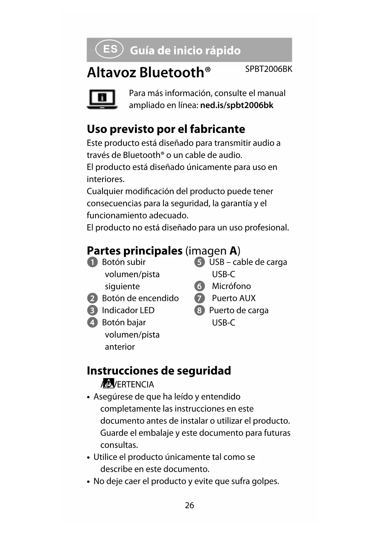 Guía de inicio rápido Altavoz Bluetooth® SPBT2006BKPara más información, consulte el manual ampliado en línea: ned.is/spbt2006bk Uso previsto por el fabricante Este producto está diseñado para transmitir audio a través de Bluetooth® o un cable de audio.El producto está diseñado únicamente para uso en interiores.Cualquier modicación del producto puede tener consecuencias para la seguridad, la garantía y el funcionamiento adecuado.El producto no está diseñado para un uso profesional. Partes principales (imagen A) 1 Botón subir volumen/pista siguiente 2 Botón de encendido 3 Indicador LED 4 Botón bajar volumen/pista anterior 5 USB – cable de carga USB-C 6 Micrófono 7 PuertoAUX 8 Puerto de carga USB-C Instrucciones de seguridad