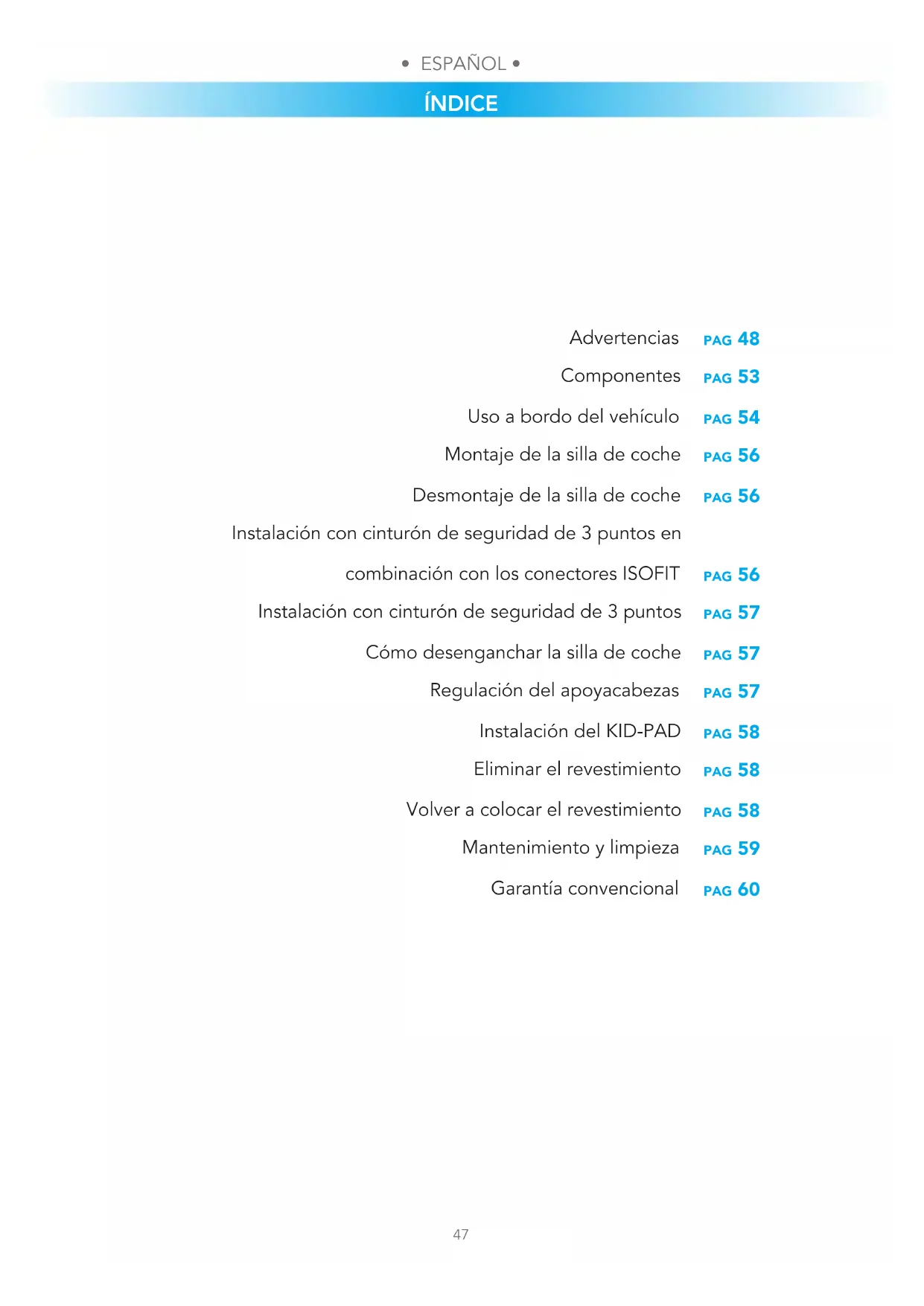 ÍNDICE pag 48 pag 53 pag 54 pag 56 pag 56 pag 56 pag 57 pag 57 pag 57 pag 58 pag 58 pag 58 pag 59 pag 60 Advertencias Componentes Uso a bordo del vehículo Montaje de la silla de coche Desmontaje de la silla de coche Instalación con cinturón de seguridad de 3 puntos en combinación con los conectores ISOFIT Instalación con cinturón de seguridad de 3 puntos Cómo desenganchar la silla de coche Regulación del apoyacabezas Instalación del KID-PAD Eliminar el revestimiento Volver a colocar el revestimiento Mantenimiento y limpieza Garantía convencional• ESPAÑOL • • ESPAÑOL •
