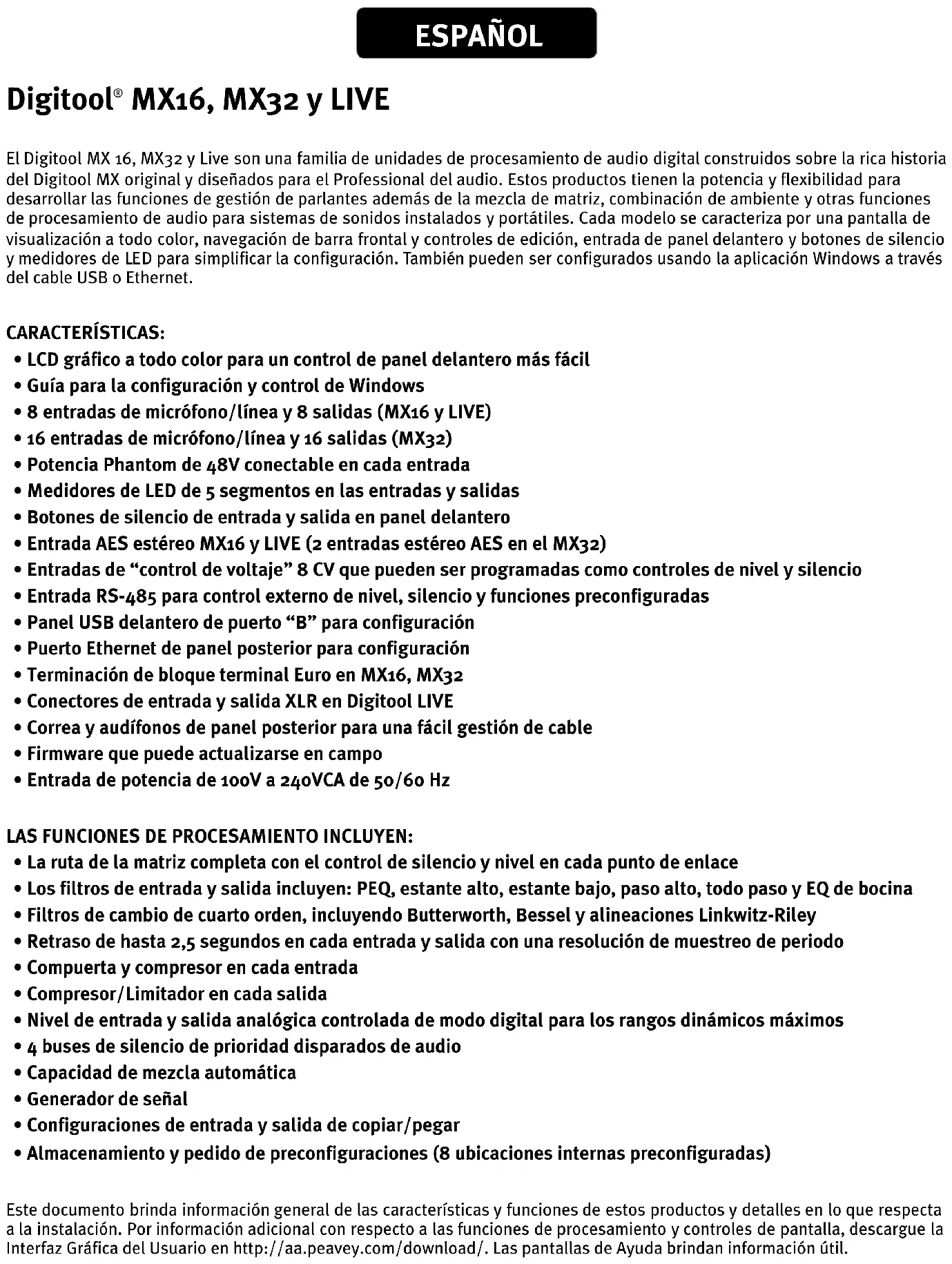 - Almacenamiento y pedido de preconfiguraciones (8 ubicaciones internas preconfiguradas) Este documento brinda información general de las características y funciones de estos productos y detalles en lo que respecta a la instalación. Por información adicional con respecto a las funciones de procesamiento y controles de pantalla, descargue la Interfaz Gráfica del Usuario en http://aa.peavey.com/download/. Las pantallas de Ayuda brindan información útil.Digitool
