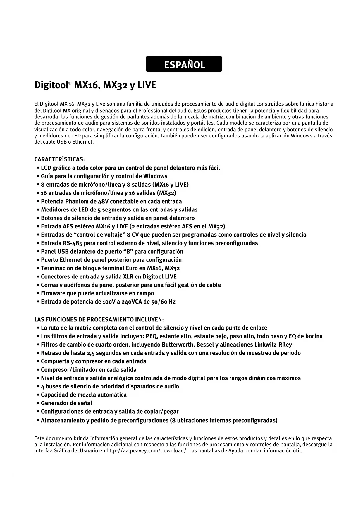 - Almacenamiento y pedido de preconfiguraciones (8 ubicaciones internas preconfiguradas) Este documento brinda información general de las características y funciones de estos productos y detalles en lo que respecta a la instalación. Por información adicional con respecto a las funciones de procesamiento y controles de pantalla, descargue la Interfaz Gráfica del Usuario en http://aa.peavey.com/download/. Las pantallas de Ayuda brindan información útil.Digitool