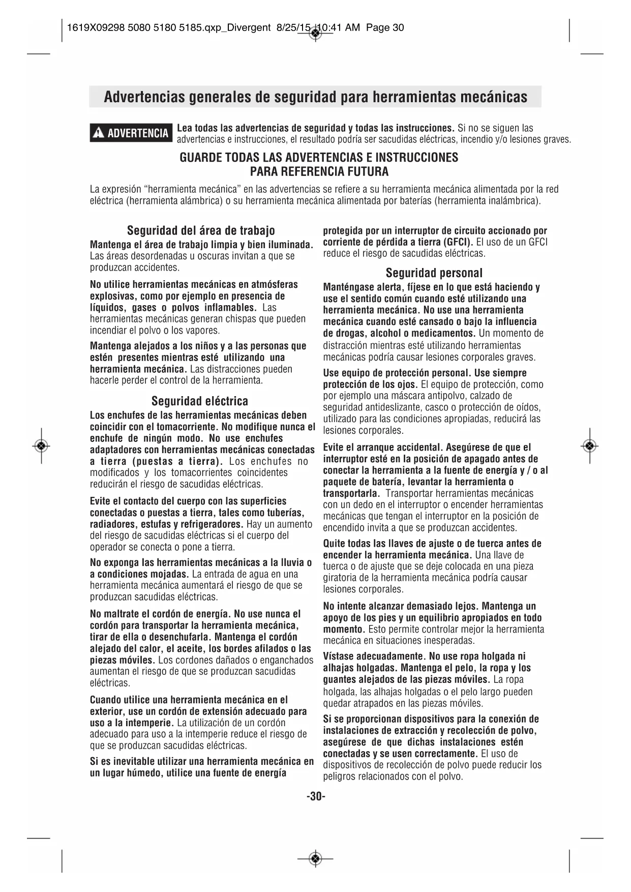 1619X09298 5080 5180 5185.qxp_Divergent 8/25/15 10:41 AM Page 29-30- Lea todas las advertencias de seguridad y todas las instrucciones. Si no se siguen las advertencias e instrucciones, el resultado podría ser sacudidas eléctricas, incendio y/o lesiones graves.
