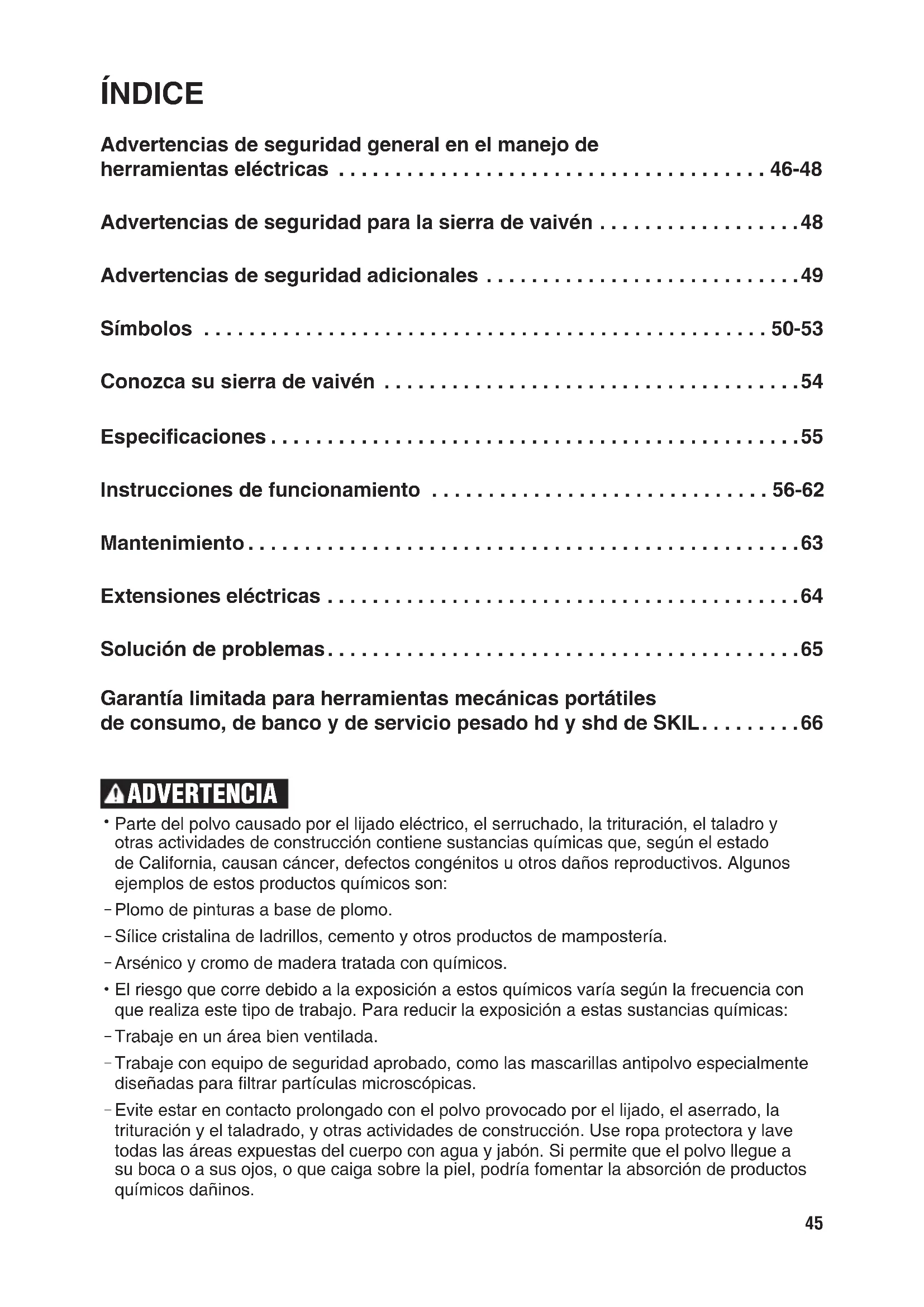 Asegure el material antes de cortarlo. Nunca lo sostenga con la mano ni sobre las piernas. Es posible que materiales delgados o pequeños se doblen o vibren con la hoja, provocando una pérdida de control. No taladre, je ni traspase una pared existente u otras áreas ocultas donde haya cableado eléctrico. Si esta situación es inevitable, desconecte todos los fusibles o interruptores de circuito que alimentan el área de trabajo. Nunca deje el gatillo bloqueado en la posición de encendido “ON”. Antes de enchufar la herramienta, verique que la traba del gatillo esté en la posición de apagado “OFF”. Los arranques accidentales pueden provocar lesiones. Tenga en cuenta la ubicación y el ajuste del botón de bloqueo del interruptor. Si el interruptor está bloqueado en la posición de encendido durante el uso, esté preparado para apagarlo en una situación de emergencia; primero apretando el gatillo y luego soltándolo inmediatamente, sin presionar el botón de bloqueo. Mantenga las manos alejadas del área de corte. No toque el área debajo del material que está cortando. La proximidad de la hoja con su mano estará oculta a la vista. No utilice hojas desaladas o dañadas. Las hojas torcidas se pueden romper fácilmente o pueden causar un contragolpe. Antes de comenzar a cortar, encienda la herramienta y deje que la hoja alcance la velocidad máxima. La herramienta puede vibrar si la velocidad de la hoja es demasiado baja al principio del corte y posiblemente haga un contragolpe. Use siempre gafas de seguridad o lentes de protección cuando utilice esta herramienta. Use una mascarilla antipolvo o un respirador para aplicaciones que generan polvo. Asegúrese de que todos los tornillos de ajuste y el soporte de la hoja estén rmes antes de realizar un corte. Si los tornillos de ajuste y los soportes están sueltos, esto podría provocar que la herramienta o la hoja se deslizaran, lo que provocaría una pérdida de control. Al retirar la hoja de la herramienta, evite el contacto con la piel y utilice guantes protectores adecuados al agarrar la hoja o el accesorio. Es posible que los accesorios estén calientes después de un uso prolongado. El uso de un interruptor de circuito de falla de puesta a tierra y de dispositivos de protección personal, como guantes de goma y calzado para electricistas, mejorarán aún más su seguridad personal. No utilice herramientas con calicación “Solo CA” con un suministro de electricidad de CC. Aunque parezca que la herramienta funciona, es probable que los componentes eléctricos de CA fallen y creen un peligro para el operador. Mantenga los mangos secos, limpios y sin aceite ni grasa. Si tiene las manos resbaladizas, no podrá controlar con seguridad la herramienta eléctrica. Implemente un programa de mantenimiento periódico para la herramienta. Cuando limpie una herramienta, no desmonte ninguna parte de esta, ya que los cables internos podrían quedar mal colocados o pellizcados, o los resortes de retorno del resguardo de seguridad podrían quedar mal puestos. Algunos productos de limpieza, como la gasolina, el tetracloruro de carbono, el amoníaco y otros, pueden dañar las piezas de plástico. Peligro de lesiones para el usuario. La reparación del cordón de alimentación solo se debe realizar en un centro de servicio la fábrica SKIL o una estación de servicio SKIL autorizada.50 SÍMBOLOS Símbolos de seguridad El objetivo de los símbolos de seguridad es captar su atención ante posibles peligros. Los símbolos de seguridad y las explicaciones que se dan merecen su atención y comprensión cuidadosa. Las advertencias del símbolo no eliminan por sí mismas ningún peligro. Las instrucciones y las advertencias que se dan no son substitutos de las medidas adecuadas de prevención de accidentes. ADVERTENCIA Asegúrese de leer y de comprender todas las instrucciones de seguridad en este manual del propietario, incluidos todos los símbolos de alerta de seguridad como “PELIGRO”, “ADVERTENCIA” y “PRECAUCIÓN” antes de usar esta herramienta. El incumplimiento de las siguientes instrucciones puede provocar descargas eléctricas, incendios y/o lesiones personales graves. Las deniciones que se ofrecen a continuación describen el nivel de gravedad de cada símbolo. Lea el manual y preste atención a dichos símbolos. Este es el símbolo de advertencia de seguridad. Se utiliza para advertirlo de los peligros de posibles lesiones personales. Cumpla con todos los mensajes de seguridad a continuación de este símbolo para evitar posibles lesiones o consecuencias fatales. PELIGRO PELIGRO indica una situación de peligro que, de no evitarse, ocasionará la muerte o lesiones graves. ADVERTENCIA ADVERTENCIA indica una situación potencialmente peligrosa que, de no evitarse, puede ocasionar la muerte o lesiones graves. PRECAUCIÓN PRECAUCIÓN, se usa con el símbolo de advertencia de seguridad e indica una situación peligrosa que, de no evitarse, puede causar lesiones menores o moderadas. Mensajes de prevención de daños e información Estos mensajes informan al usuario sobre informaciones y/o instrucciones importantes que, de no seguirse, pueden causar daños al equipo o la propiedad. Antes de cada mensaje, aparece la palabra “AVISO”, como en el ejemplo a continuación: AVISO: Si no se siguen estas instrucciones se pueden producir daños al equipo o la propiedad. ADVERTENCIA Durante el funcionamiento de cualquier herramienta eléctrica, pueden entrar objetos extraños a los ojos y causar graves daños oculares. Use siempre lentes o gafas de seguridad con protecciones laterales y, cuando sea necesario, un protector facial que cubra todo el rostro antes de comenzar a operar una herramienta eléctrica. Recomendamos usar una máscara de seguridad de visión amplia sobre los lentes o las gafas de seguridad estándar con protección lateral. Siempre use lentes de protección que cumplan con la norma ANSI Z87.1.51 SÍMBOLOS (CONTINUACI