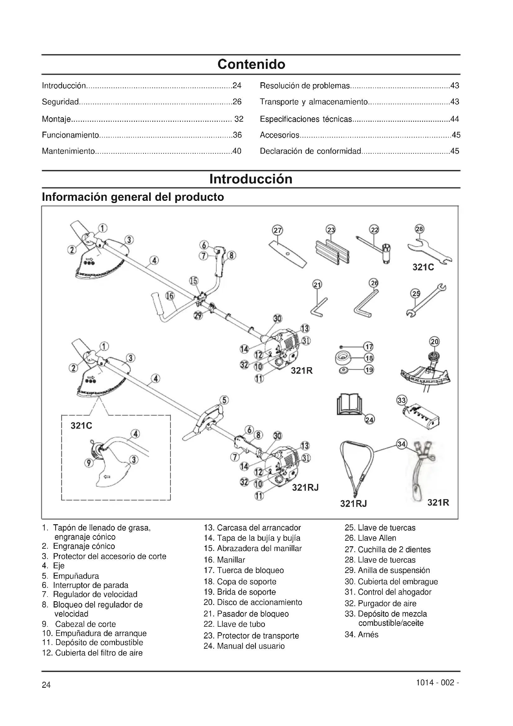321C 241014 - 002 - Símbolos en el producto ADVERTENCIA: Este producto es peligroso. Si el producto no se utiliza con cuidado y correctamente, puede provocar lesiones e incluso la muerte al usuario o los transeúntes. Para evitar lesiones al usuario o los transeúntes, lea y respete todas las instrucciones de seguridad incluidas en el manual del usuario. Lea el manual del usuario atentamente y asegúrese de comprender las instrucciones antes de usar el producto. Este producto cumple con las directivas de la CE aplicables. Use un casco protector en lugares donde exista la posibilidad de que le caigan objetos en la cabeza. Use un equipo de protección para los oídos aprobado. Use un equipo de protección ocular aprobado. Use guantes protectores aprobados. Use botas resistentes y antideslizantes. Este producto puede hacer que los objetos salgan despedidos, lo cual puede causar lesiones (321R, 321RJ). Mantenga un mínimo de 15 m de distancia de las personas y animales durante el uso del producto. Este producto puede hacer que los objetos salgan despedidos, lo cual puede causar lesiones (321C). Velocidad máxima del eje de salida.