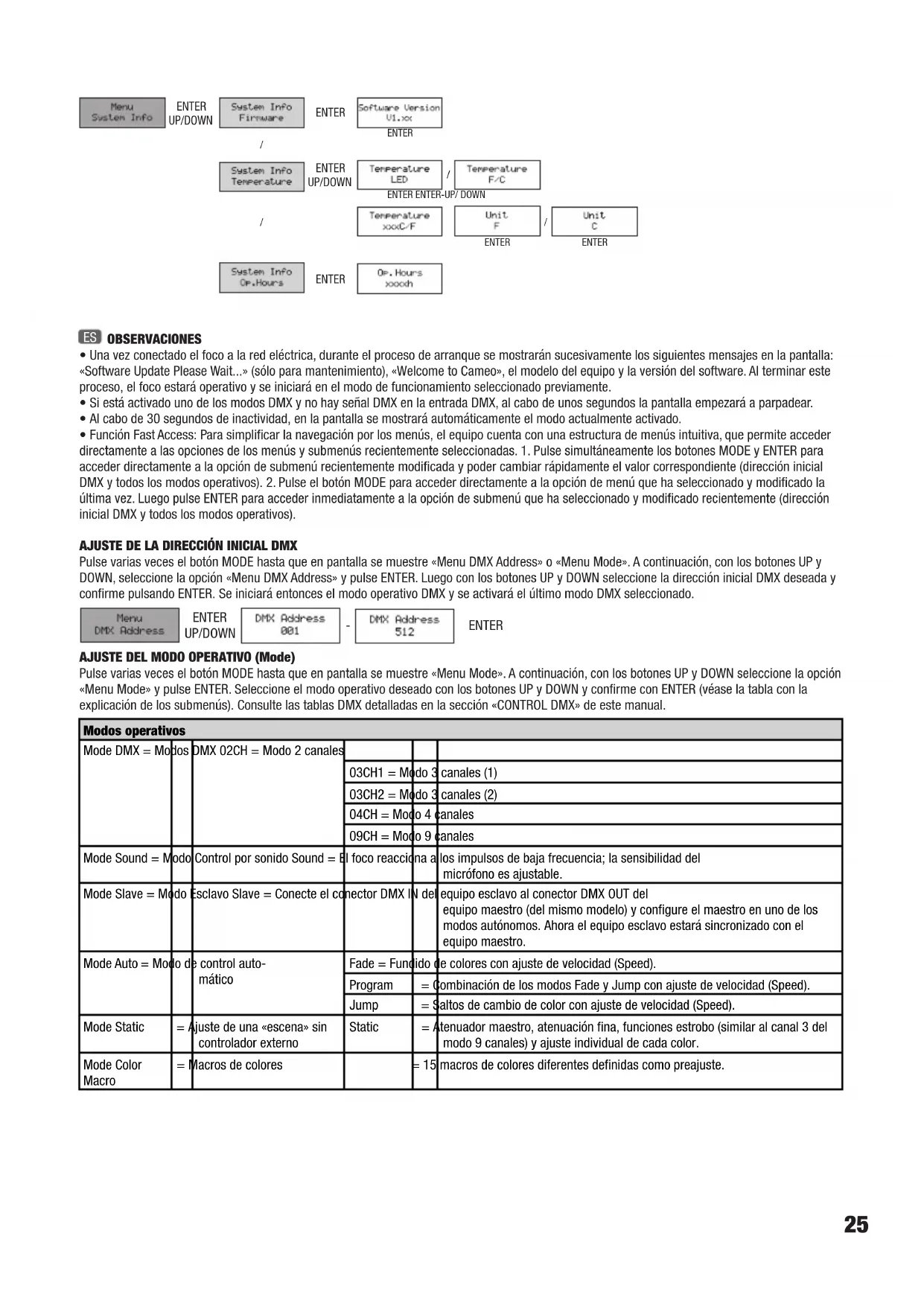 - Función Fast Access: Para simplificar la navegación por los menús, el equipo cuenta con una estructura de menús intuitiva, que permite acceder directamente a las opciones de los menús y submenús recientemente seleccionadas. 1. Pulse simultáneamente los botones MODE y ENTER para acceder directamente a la opción de submenú recientemente modificada y poder cambiar rápidamente el valor correspondiente (dirección inicial DMX y todos los modos operativos). 2. Pulse el botón MODE para acceder directamente a la opción de menú que ha seleccionado y modificado la última vez. Luego pulse ENTER para acceder inmediatamente a la opción de submenú que ha seleccionado y modificado recientemente (dirección inicial DMX y todos los modos operativos). AJUSTE DE LA DIRECCIÓN INICIAL DMX Pulse varias veces el botón MODE hasta que en pantalla se muestre «Menu DMX Address» o «Menu Mode». A continuación, con los botones UP y DOWN, seleccione la opción «Menu DMX Address» y pulse ENTER. Luego con los botones UP y DOWN seleccione la dirección inicial DMX deseada y confirme pulsando ENTER. Se iniciará entonces el modo operativo DMX y se activará el último modo DMX seleccionado. ENTER UP/DOWN