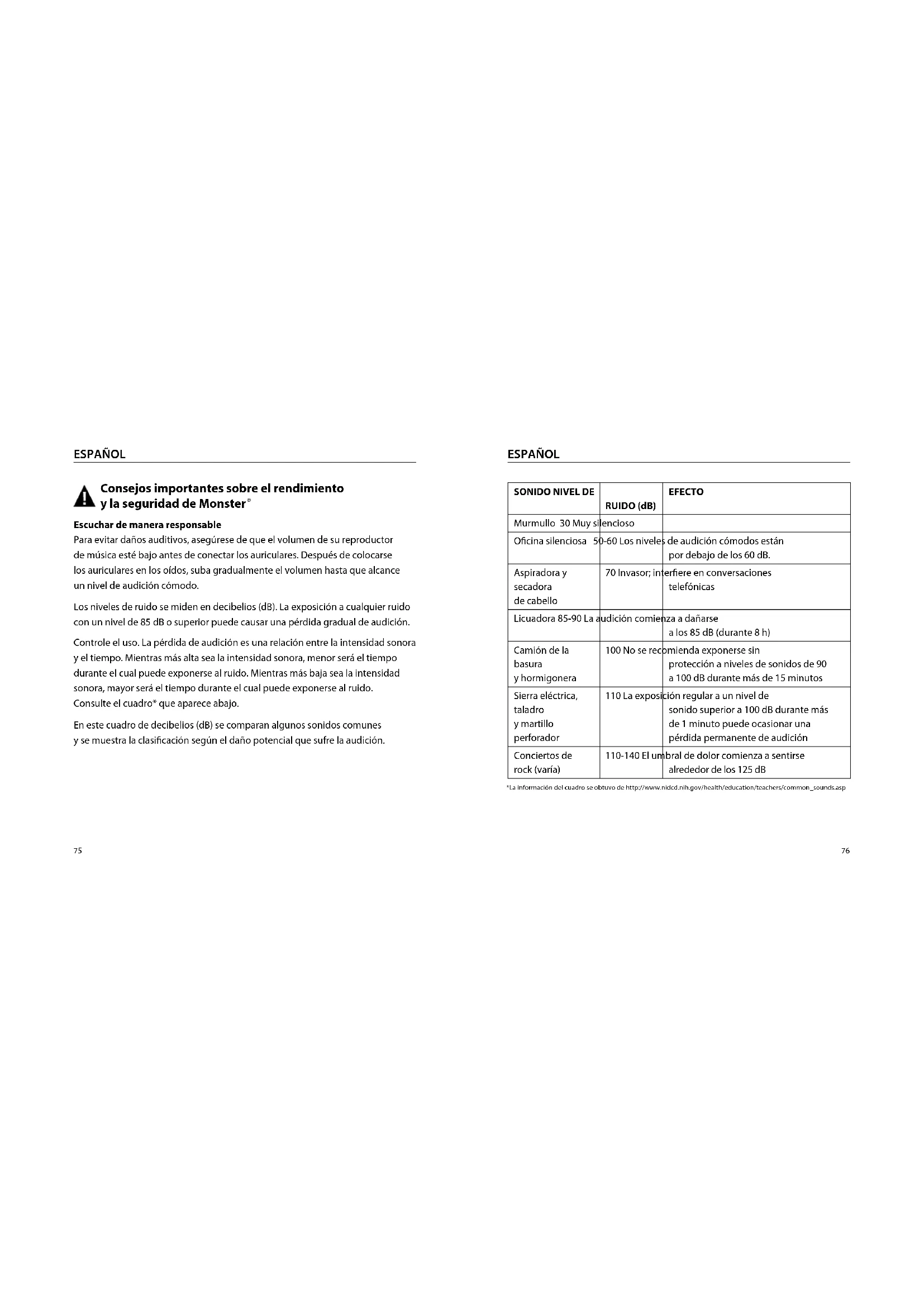 ESPAÑOL “…. una persona común puede escuchar de forma segura un iPod durante 4,6 horas diarias a un 70% del volumen”. “…es sumamente importante conocer los niveles a los que uno escucha música y durante cuánto tiempo”. De http://www.cbc.ca/health/story/2006/10/19/music-earphones.html Obtenga el máximo provecho de su equipo y disfrute de un excelente rendimiento del audio incluso a niveles seguros. Nuestros auriculares le permitirán escuchar más detalles a niveles de volumen más bajos, como nunca antes. Fisiología del oído y de la audición Para obtener información adicional sobre cómo afectan al oído los ruidos fuertes y sobre la referencia del cuadro visite http://www.abelard.org/hear/hear.php#loud-music Usar los auriculares de manera responsable No use los auriculares cuando no sea seguro: mientras conduce un vehículo, cuando cruza la calle o durante cualquier actividad o en cualquier ambiente donde deba poner toda su atención. Es peligroso conducir con los auriculares puestos y en muchos lugares es ilegal, ya que reduce la posibilidad de escuchar sonidos de alerta en la calle como la bocina de otro automóvil y las sirenas de vehículos de emergencia. Evite usar auriculares mientras conduce. Como alternativa, utilice uno de los transmisores FM de Monster para escuchar los dispositivos de medios móviles. Aprenda cómo establecer un nivel de audición seguro y revise otras pautas de seguridad importantes en los sitios web de la Asociación de consumidores de electrónica (Consumer Electronics Association) en www.ce.org y de la Fundación de investigación de la sordera (Deafness Research Foundation) en www.drf.org.79 ESPAÑOL
