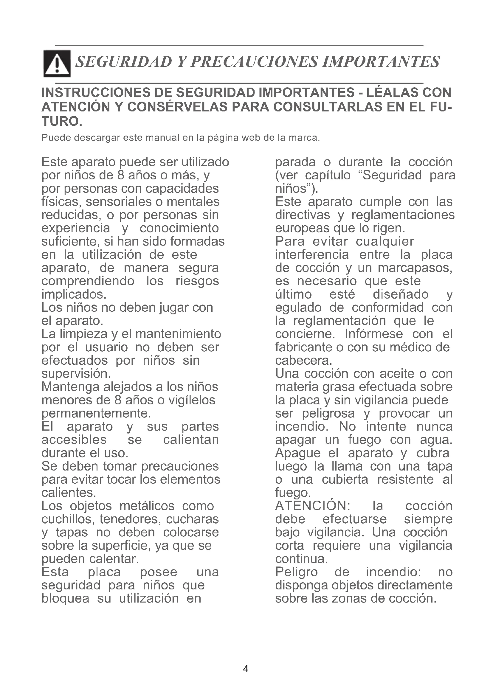 INSTRUCCIONES DE SEGURIDAD IMPORTANTES - LÉALAS CON ATENCIÓN Y CONSÉRVELAS PARA CONSULTARLAS EN EL FU- TURO. Puede descargar este manual en la página web de la marca. Este aparato puede ser utilizado por niños de 8 años o más, y por personas con capacidades físicas, sensoriales o mentales reducidas, o por personas sin experiencia y conocimiento suciente, si han sido formadas en la utilización de este aparato, de manera segura comprendiendo los riesgos implicados. Los niños no deben jugar con el aparato. La limpieza y el mantenimiento por el usuario no deben ser efectuados por niños sin supervisión. Mantenga alejados a los niños menores de 8 años o vigílelos permanentemente. El aparato y sus partes accesibles se calientan durante el uso. Se deben tomar precauciones para evitar tocar los elementos calientes. Los objetos metálicos como cuchillos, tenedores, cucharas y tapas no deben colocarse sobre la supercie, ya que se pueden calentar. Esta placa posee una seguridad para niños que bloquea su utilización en parada o durante la cocción (ver capítulo “Seguridad para niños”). Este aparato cumple con las directivas y reglamentaciones europeas que lo rigen. Para evitar cualquier interferencia entre la placa de cocción y un marcapasos, es necesario que este último esté diseñado y egulado de conformidad con la reglamentación que le concierne. Infórmese con el fabricante o con su médico de cabecera. Una cocción con aceite o con materia grasa efectuada sobre la placa y sin vigilancia puede ser peligrosa y provocar un incendio. No intente nunca apagar un fuego con agua. Apague el aparato y cubra luego la llama con una tapa o una cubierta resistente al fuego. ATENCIÓN: la cocción debe efectuarse siempre bajo vigilancia. Una cocción corta requiere una vigilancia continua. Peligro de incendio: no disponga objetos directamente sobre las zonas de cocción.5