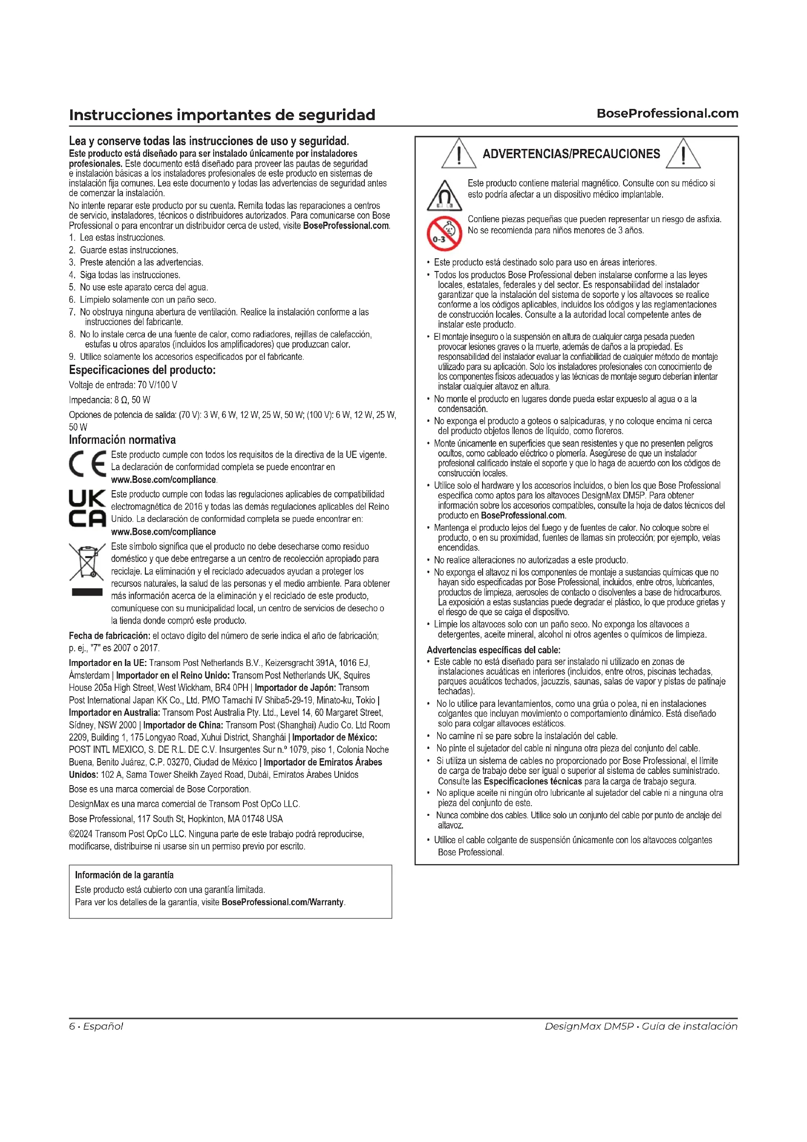 Información normativa Este producto cumple con todos los requisitos de la directiva de la UE vigente. La declaración de conformidad completa se puede encontrar en www.Bose.com/compliance. Este producto cumple con todas las regulaciones aplicables de compatibilidad electromagnética de 2016 y todas las demás regulaciones aplicables del Reino Unido. La declaración de conformidad completa se puede encontrar en: www.Bose.com/compliance Este símbolo signica que el producto no debe desecharse como residuo doméstico y que debe entregarse a un centro de recolección apropiado para reciclaje. La eliminación y el reciclado adecuados ayudan a proteger los recursos naturales, la salud de las personas y el medio ambiente. Para obtener más información acerca de la eliminación y el reciclado de este producto, comuníquese con su municipalidad local, un centro de servicios de desecho o la tienda donde compró este producto. Fecha de fabricación: el octavo dígito del número de serie indica el año de fabricación; p. ej., "7" es 2007 o 2017. Importador en la UE: Transom Post Netherlands B.V., Keizersgracht 391A, 1016 EJ, Ámsterdam | Importador en el Reino Unido: Transom Post Netherlands UK, Squires House 205a High Street, West Wickham, BR4 0PH | Importador de Japón: Transom Post International Japan KK Co., Ltd. PMO Tamachi IV Shiba5-29-19, Minato-ku, Tokio | Importador en Australia: Transom Post Australia Pty. Ltd., Level 14, 60 Margaret Street, Sídney, NSW 2000 | Importador de China: Transom Post (Shanghai) Audio Co. Ltd Room 2209, Building 1, 175 Longyao Road, Xuhui District, Shanghái | Importador de México: POST INTL MEXICO, S. DE R.L. DE C.V. Insurgentes Sur n.º 1079, piso 1, Colonia Noche Buena, Benito Juárez, C.P. 03270, Ciudad de México | Importador de Emiratos Árabes Unidos: 102 A, Sama Tower Sheikh Zayed Road, Dubái, Emiratos Árabes Unidos Bose es una marca comercial de Bose Corporation. DesignMax es una marca comercial de Transom Post OpCo LLC. Bose Professional, 117 South St, Hopkinton, MA 01748 USA ©2024 Transom Post OpCo LLC. Ninguna parte de este trabajo podrá reproducirse, modicarse, distribuirse ni usarse sin un permiso previo por escrito. Información de la garantía Este producto está cubierto con una garantía limitada. Para ver los detalles de la garantía, visite BoseProfessional.com/Warranty. Especicaciones del producto: Voltaje de entrada: 70 V/100 V Impedancia: 8 Ω, 50 W Opciones de potencia de salida: (70 V): 3 W, 6 W, 12 W, 25 W, 50 W; (100 V): 6 W, 12 W, 25 W, 50 W ADVERTENCIAS/PRECAUCIONES Este producto contiene material magnético. Consulte con su médico si esto podría afectar a un dispositivo médico implantable. Contiene piezas pequeñas que pueden representar un riesgo de asxia. No se recomienda para niños menores de 3 años.