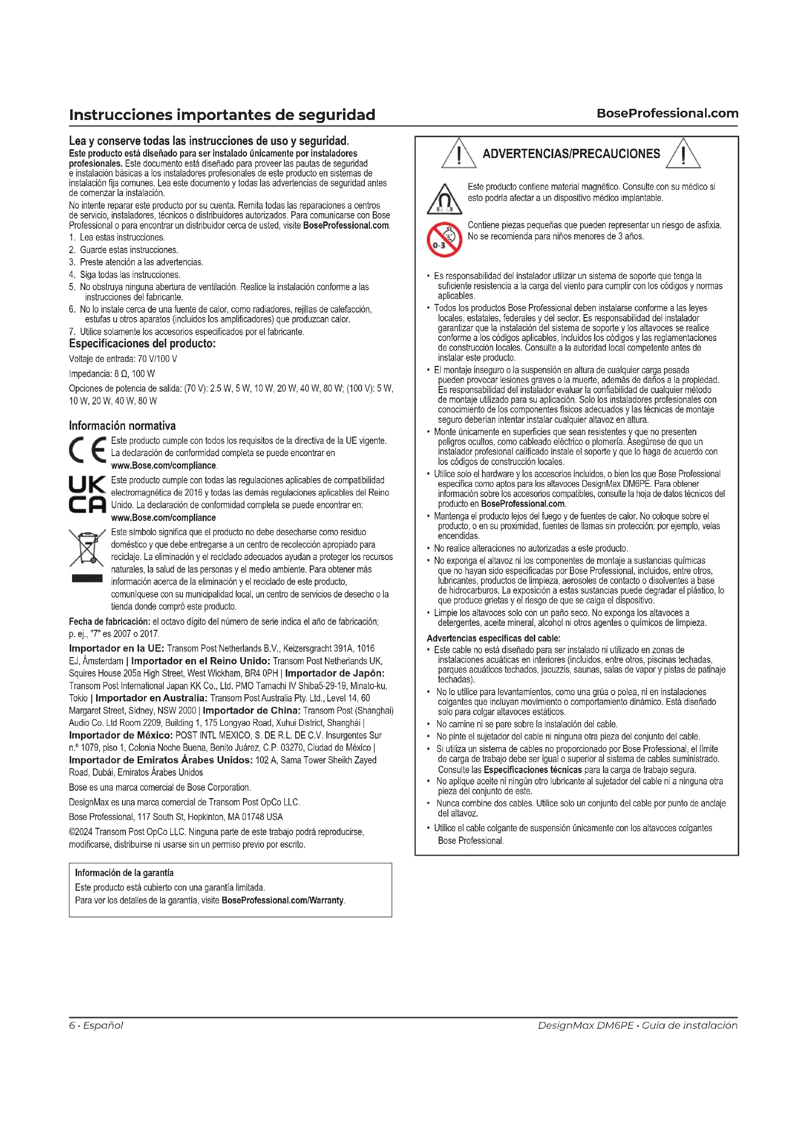 Información normativa Este producto cumple con todos los requisitos de la directiva de la UE vigente. La declaración de conformidad completa se puede encontrar en www.Bose.com/compliance. Este producto cumple con todas las regulaciones aplicables de compatibilidad electromagnética de 2016 y todas las demás regulaciones aplicables del Reino Unido. La declaración de conformidad completa se puede encontrar en: www.Bose.com/compliance Este símbolo signica que el producto no debe desecharse como residuo doméstico y que debe entregarse a un centro de recolección apropiado para reciclaje. La eliminación y el reciclado adecuados ayudan a proteger los recursos naturales, la salud de las personas y el medio ambiente. Para obtener más información acerca de la eliminación y el reciclado de este producto, comuníquese con su municipalidad local, un centro de servicios de desecho o la tienda donde compró este producto. Fecha de fabricación: el octavo dígito del número de serie indica el año de fabricación; p. ej., "7" es 2007 o 2017. Importador en la UE: Transom Post Netherlands B.V., Keizersgracht 391A, 1016 EJ, Ámsterdam | Importador en el Reino Unido: Transom Post Netherlands UK, Squires House 205a High Street, West Wickham, BR4 0PH | Importador de Japón: Transom Post International Japan KK Co., Ltd. PMO Tamachi IV Shiba5-29-19, Minato-ku, Tokio | Importador en Australia: Transom Post Australia Pty. Ltd., Level 14, 60 Margaret Street, Sídney, NSW 2000 | Importador de China: Transom Post (Shanghai) Audio Co. Ltd Room 2209, Building 1, 175 Longyao Road, Xuhui District, Shanghái | Importador de México: POST INTL MEXICO, S. DE R.L. DE C.V. Insurgentes Sur n.º 1079, piso 1, Colonia Noche Buena, Benito Juárez, C.P. 03270, Ciudad de México | Importador de Emiratos Árabes Unidos: 102 A, Sama Tower Sheikh Zayed Road, Dubái, Emiratos Árabes Unidos Bose es una marca comercial de Bose Corporation. DesignMax es una marca comercial de Transom Post OpCo LLC. Bose Professional, 117 South St, Hopkinton, MA 01748 USA ©2024 Transom Post OpCo LLC. Ninguna parte de este trabajo podrá reproducirse, modicarse, distribuirse ni usarse sin un permiso previo por escrito. Información de la garantía Este producto está cubierto con una garantía limitada. Para ver los detalles de la garantía, visite BoseProfessional.com/Warranty. Especicaciones del producto: Voltaje de entrada: 70 V/100 V Impedancia: 8 Ω, 100 W Opciones de potencia de salida: (70 V): 2.5 W, 5 W, 10 W, 20 W, 40 W, 80 W; (100 V): 5 W, 10 W, 20 W, 40 W, 80 W ADVERTENCIAS/PRECAUCIONES Este producto contiene material magnético. Consulte con su médico si esto podría afectar a un dispositivo médico implantable. Contiene piezas pequeñas que pueden representar un riesgo de asxia. No se recomienda para niños menores de 3 años.