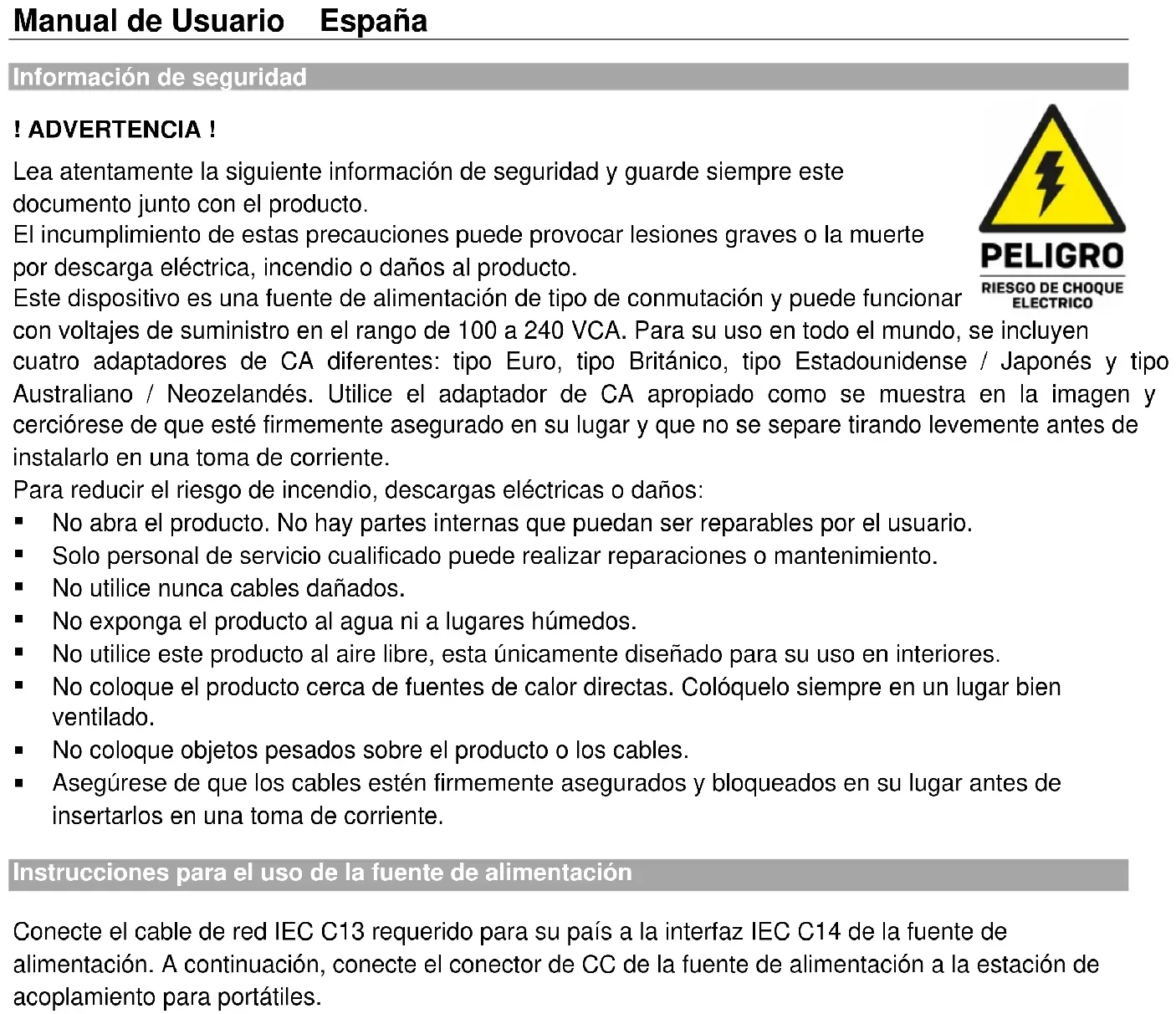 Asegúrese de que los cables estén firmemente asegurados y bloqueados en su lugar antes de insertarlos en una toma de corriente. Instrucciones para el uso de la fuente de alimentación Conecte el cable de red IEC C13 requerido para su país a la interfaz IEC C14 de la fuente de alimentación. A continuación, conecte el conector de CC de la fuente de alimentación a la estación de acoplamiento para portátiles.Manual de Usuario España