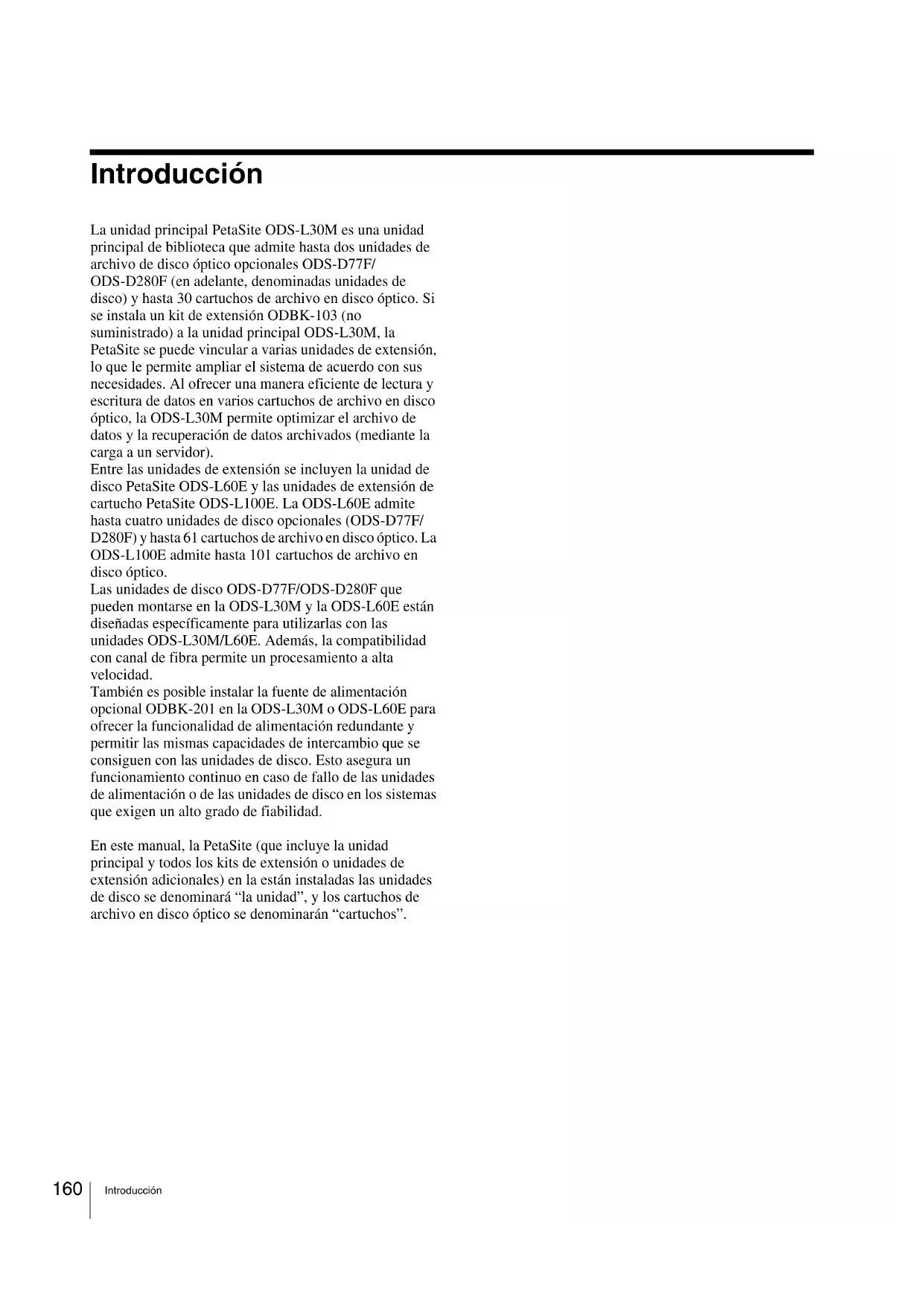 - Especificaciones 60 Introducción Introducción La unidad principal PetaSite ODS-L30M es una unidad principal de biblioteca que admite hasta dos unidades de archivo de disco óptico opcionales ODS-D77F/ ODS-D280F (en adelante, denominadas unidades de disco) y hasta 30 cartuchos de archivo en disco óptico. Si se instala un kit de extensión ODBK-103 (no suministrado) a la unidad principal ODS-L30M, la PetaSite se puede vincular a varias unidades de extensión, lo que le permite ampliar el sistema de acuerdo con sus necesidades. Al ofrecer una manera eficiente de lectura y escritura de datos en varios cartuchos de archivo en disco óptico, la ODS-L30M permite optimizar el archivo de datos y la recuperación de datos archivados (mediante la carga a un servidor). Entre las unidades de extensión se incluyen la unidad de disco PetaSite ODS-L60E y las unidades de extensión de cartucho PetaSite ODS-L100E. La ODS-L60E admite hasta cuatro unidades de disco opcionales (ODS-D77F/ D280F) y hasta 61 cartuchos de archivo en disco óptico. La ODS-L100E admite hasta 101 cartuchos de archivo en disco óptico. Las unidades de disco ODS-D77F/ODS-D280F que pueden montarse en la ODS-L30M y la ODS-L60E están diseñadas específicamente para utilizarlas con las unidades ODS-L30M/L60E. Además, la compatibilidad con canal de fibra permite un procesamiento a alta velocidad. También es posible instalar la fuente de alimentación opcional ODBK-201 en la ODS-L30M o ODS-L60E para ofrecer la funcionalidad de alimentación redundante y permitir las mismas capacidades de intercambio que se consiguen con las unidades de disco. Esto asegura un funcionamiento continuo en caso de fallo de las unidades de alimentación o de las unidades de disco en los sistemas que exigen un alto grado de fiabilidad. En este manual, la PetaSite (que incluye la unidad principal y todos los kits de extensión o unidades de extensión adicionales) en la están instaladas las unidades de disco se denominará “la unidad”, y los cartuchos de archivo en disco óptico se denominarán “cartuchos”.161 Introducción Ejemplo de configuración del sistema Los siguientes tipos de sistemas se pueden construir con la unidad en combinación con equipo relacionado. Para obtener más información acerca de la configuración de servidor recomendada para la conexión de una unidad de disco, descargue la nota técnica del sitio de Sony Creative Software (página 187). Conmutador Gigabit Ethernet Ordenador Macintosh Ordenador Windows Servidor (con aplicación HSM) Conmutador de canal de fibra Esta unidad Ethernet Almacenamiento Servidor (con aplicación MAM) Canal de fibra162 Nombre y función de las piezas Nombre y función de las piezas ODS-L30M Panel frontal El panel frontal de la ODS-L30M puede extraerse e intercambiarse con los paneles frontales de las unidades de extensión ODS-L60E/L100E. La ODS-L30M se instalará en la parte inferior de una pila de varias unidades, pero su panel frontal puede instalarse en una unidad de extensión cuya altura permita un funcionamiento más fácil. a Botón e indicador de encendido/en espera Alterna la unidad entre los modos de encendido y en espera si los interruptores de alimentación principal del panel trasero están encendidos. Pulse el botón cuando esté encendida para cambiar al modo en espera. Aparece en la pantalla un mensaje de confirmación de apagado. Utilice el botón de flecha para seleccionar “Yes” y, a continuación, pulse el botón ENTER. El indicador se enciende de color verde cuando la unidad está encendida, y de color rojo cuando está en modo en espera. El indicador parpadea en color verde cuando la unidad se está apagando. p. 1861