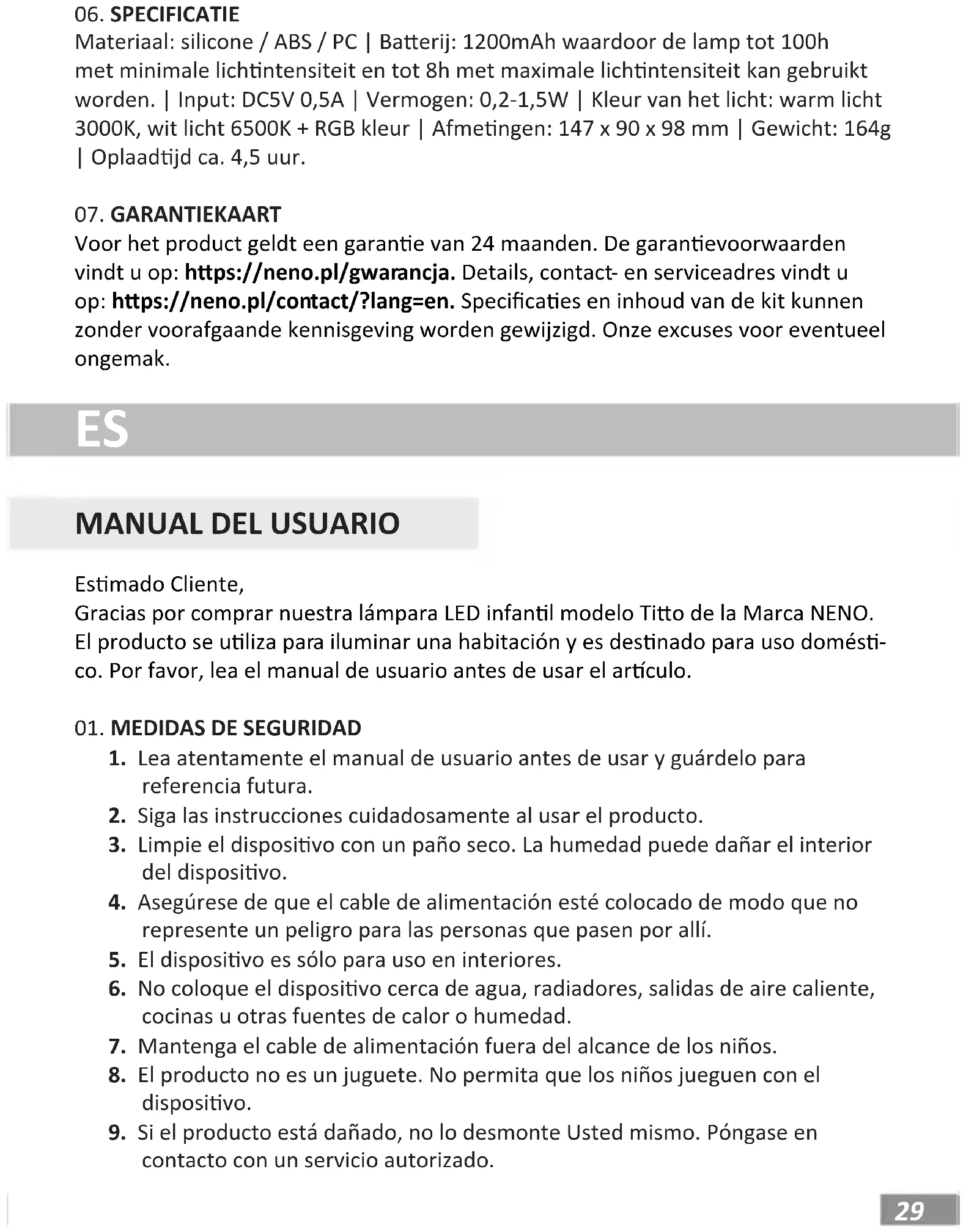 Esmado Cliente, Gracias por comprar nuestra lámpara LED infanl modelo Tio de la Marca NENO. El producto se uliza para iluminar una habitación y es desnado para uso domés- co. Por favor, lea el manual de usuario antes de usar el arculo.