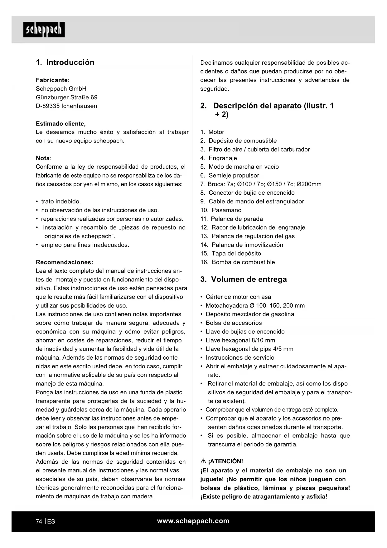 Fabricante: Scheppach GmbH Günzburger Straße 69 D-89335 Ichenhausen Estimado cliente, Le deseamos mucho éxito y satisfacción al trabajar con su nuevo equipo scheppach. Nota: Conforme a la ley de responsabilidad de productos, el fabricante de este equipo no se responsabiliza de los da- ños causados por yen el mismo, en los casos siguientes: