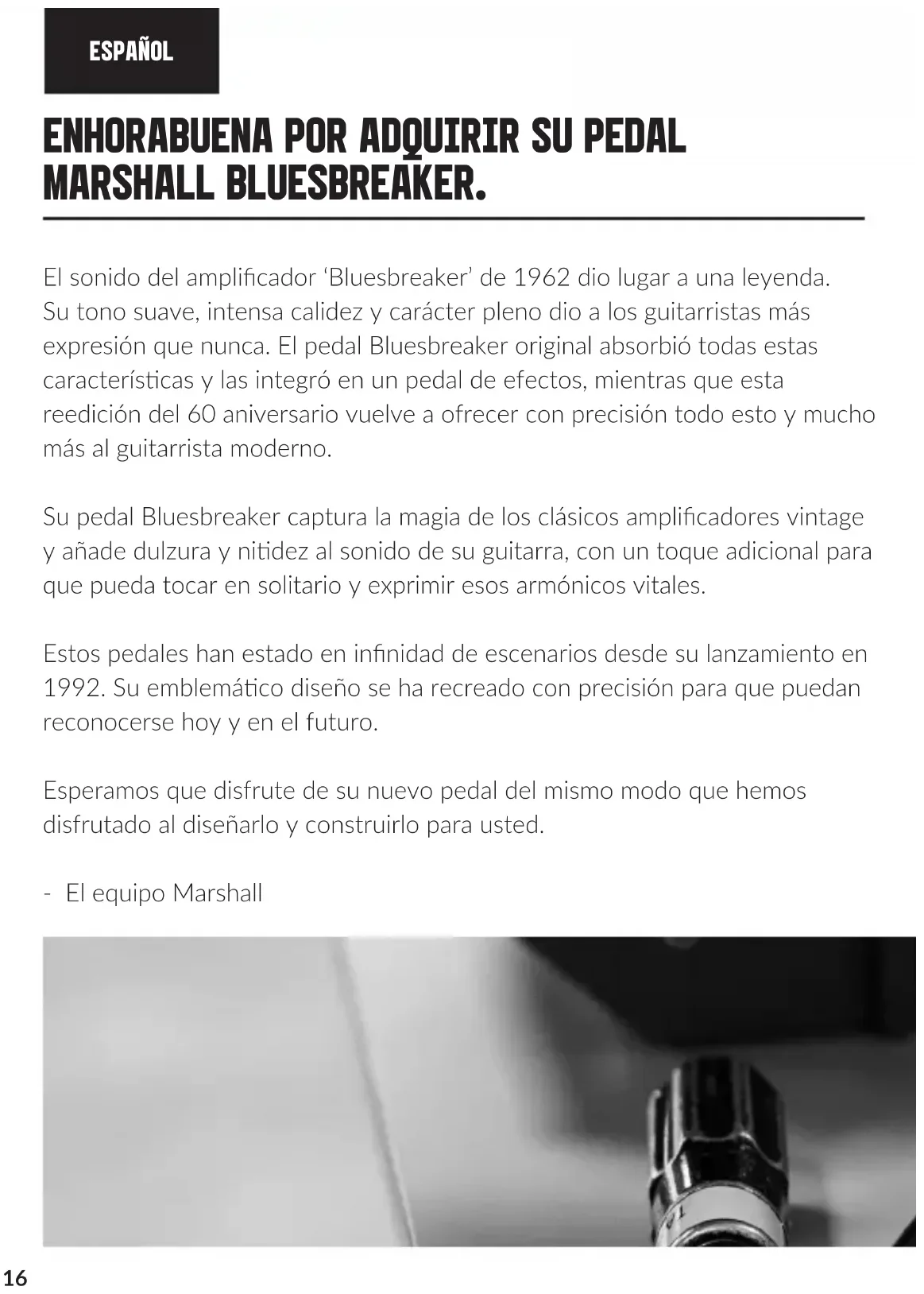 MARSHALL BLUESBREAKER. El sonido del amplicador ‘Bluesbreaker’ de 1962 dio lugar a una leyenda. Su tono suave, intensa calidez y carácter pleno dio a los guitarristas más expresión que nunca. El pedal Bluesbreaker original absorbió todas estas caracteríscas y las integró en un pedal de efectos, mientras que esta reedición del 60 aniversario vuelve a ofrecer con precisión todo esto y mucho más al guitarrista moderno. Su pedal Bluesbreaker captura la magia de los clásicos amplicadores vintage y añade dulzura y nidez al sonido de su guitarra, con un toque adicional para que pueda tocar en solitario y exprimir esos armónicos vitales. Estos pedales han estado en innidad de escenarios desde su lanzamiento en 1992. Su emblemáco diseño se ha recreado con precisión para que puedan reconocerse hoy y en el futuro. Esperamos que disfrute de su nuevo pedal del mismo modo que hemos disfrutado al diseñarlo y construirlo para usted. - El equipo Marshall