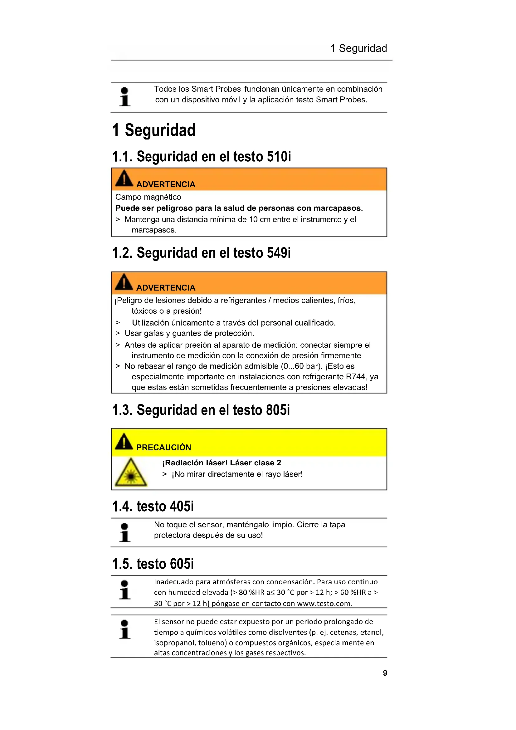 Todos los Smart Probes funcionan únicamente en combinación con un dispositivo móvil y la aplicación testo Smart Probes. 1 Seguridad 1.1. Seguridad en el testo 510i ADVERTENCIA Campo magnético Puede ser peligroso para la salud de personas con marcapasos. > Mantenga una distancia mínima de 10 cm entre el instrumento y el marcapasos. 1.2. Seguridad en el testo 549i