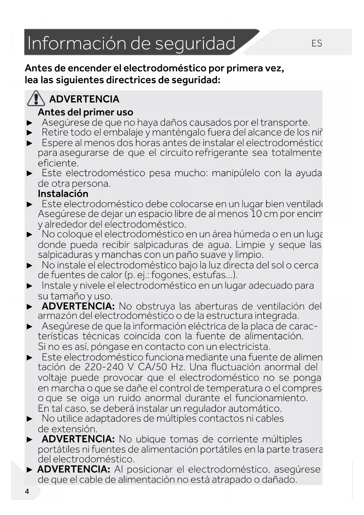 Informació n de seguridad Antes de encender el electrodoméstico por primera vez, lea las siguientes directrices de seguridad: ADVERTENCIA Antes del primer uso ► Asegúrese de que no haya daños causados por el transporte. ► Retire todo el embalaje y manténgalo fuera del alcance de los niños. ► Espere al menos dos horas antes de instalar el electrodoméstico para asegurarse de que el circuito refrigerante sea totalmente eficiente. ► Este electrodoméstico pesa mucho: manipúlelo con la ayuda de otra persona. Instalación ► Este electrodoméstico debe colocarse en un lugar bien ventilado. Asegúrese de dejar un espacio libre de al menos 10 cm por encima y alrededor del electrodoméstico. ► No coloque el electrodoméstico en un área húmeda o en un lugar donde pueda recibir salpicaduras de agua. Limpie y seque las salpicaduras y manchas con un paño suave y limpio. ► No instale el electrodoméstico bajo la luz directa del sol o cerca de fuentes de calor (p. ej.: fogones, estufas...). ► Instale y nivele el electrodoméstico en un lugar adecuado para su tamaño y uso. ► ADVERTENCIA: No obstruya las aberturas de ventilación del armazón del electrodoméstico o de la estructura integrada. ► Asegúrese de que la información eléctrica de la placa de carac- terísticas técnicas coincida con la fuente de alimentación. Si no es así, póngase en contacto con un electricista. ► Este electrodoméstico funciona mediante una fuente de alimen- tación de 220-240 V CA/50 Hz. Una fluctuación anormal del voltaje puede provocar que el electrodoméstico no se ponga en marcha o que se dañe el control de temperatura o el compresor, o que se oiga un ruido anormal durante el funcionamiento. En tal caso, se deberá instalar un regulador automático. ► No utilice adaptadores de múltiples contactos ni cables de extensión. ► ADVERTENCIA: No ubique tomas de corriente múltiples portátiles ni fuentes de alimentación portátiles en la parte trasera del electrodoméstico. ► ADVERTENCIA: Al posicionar el electrodoméstico, asegúrese de que el cable de alimentación no está atrapado o dañado.ES Información de seguridad