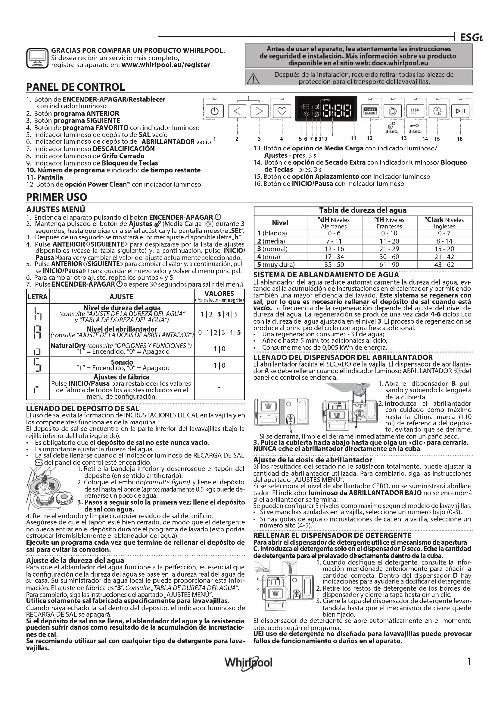 Antes de usar el aparato, lea atentamente las instrucciones de seguridad e instalación. Más información sobre su producto disponible en el sitio web: docs.whirlpool.eu Después de la instalación, recuerde retirar todas las piezas de protección para el transporte del lavavajillas. AJUSTES MENÚ