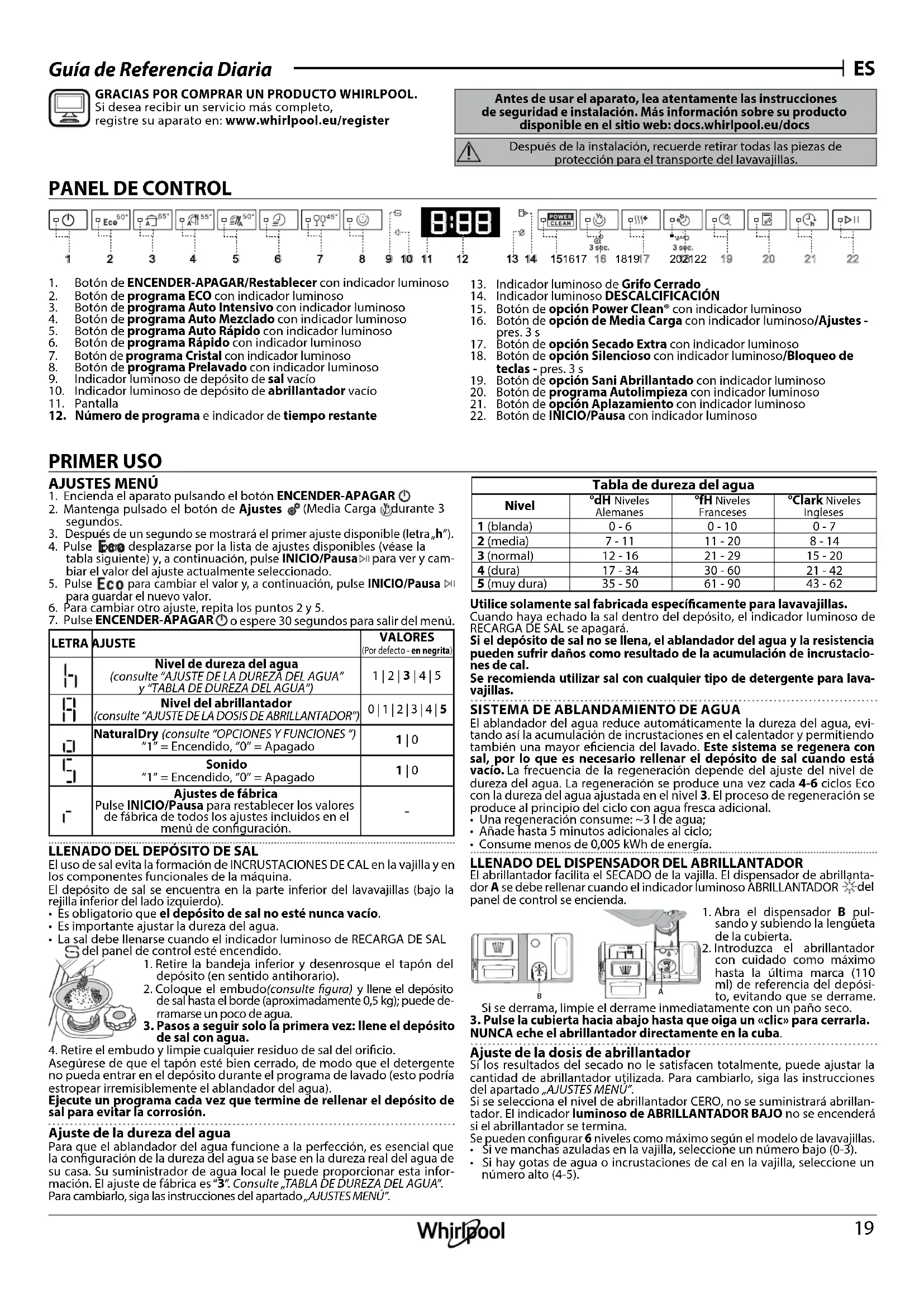 Guía de Referencia Diaria GRACIAS POR COMPRAR UN PRODUCTO WHIRLPOOL. Si desea recibir un servicio más completo, registre su aparato en: www.whirlpool.eu/register PRIMER USO Antes de usar el aparato, lea atentamente las instrucciones de seguridad e instalación. Más información sobre su producto disponible en el sitio web: docs.whirlpool.eu/docs Después de la instalación, recuerde retirar todas las piezas de protección para el transporte del lavavajillas. AJUSTES MENÚ