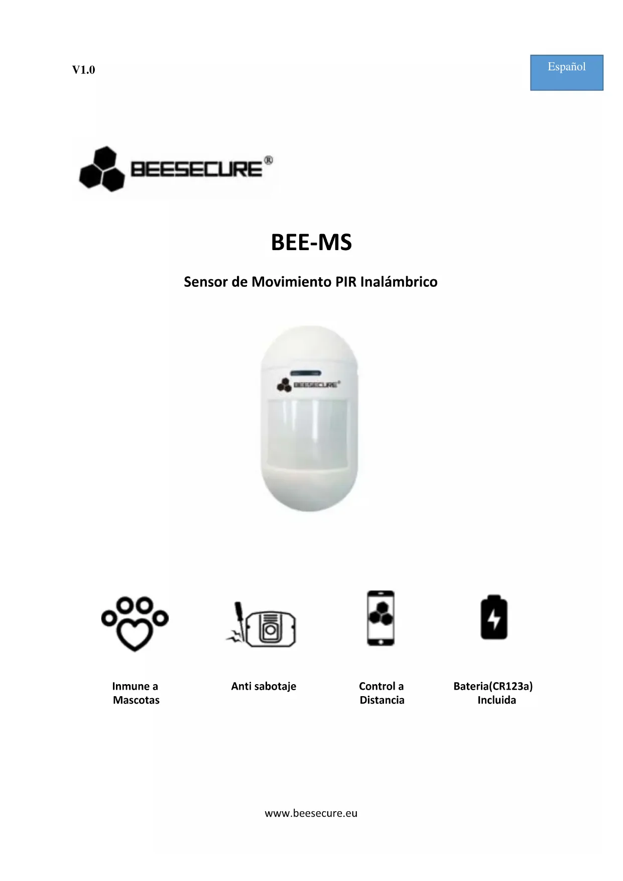 Inmune a Mascotas Anti sabotaje Control a Distancia Bateria(CR123a) IncluidaV1.0 www.beesecure.eu Español Gracias por elegir el sensor de movimiento inmune a animales BEE-MS de BeeSecure. BEE-MS es un sensor de movimiento infrarrojo pasivo, libre de cables e inmune a animales, con alta precisión para detectar el movimiento dentro de un área monitoreada asignada. El sensor de movimiento ignorará a una mascota que pese hasta 25 Kg para prevenir alarmas falsas. Cada vez que se detecte un tamaño mayor (mayor de 25kg) recibirá una alerta por medio de una notificación a su móvil. Puede configurar a distancia el sensor de movimiento desde la aplicación BeeSecure (BEE-HUB requerido). Asegurarse de leer el manual de usuario antes de utilizar el BEE-MS. Para leer la versión completa del manual del usuario en línea para agregar y configurar su BEE-MS desde la aplicación, escanear el siguiente código QR: Descargar BeeSecure App