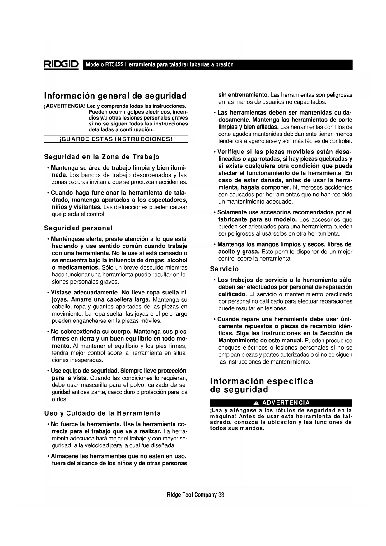 - Cuande repare una herramienta debe usar úni- camente repuestos o piezas de recambio idén- ticas. Siga las instrucciones en la Sección de Mantenimiento de este manual. Pueden producirse choques eléctricos o lesiones personales si no se emplean piezas y partes autorizadas o si no se siguen las instrucciones de mantenimiento. Información específica de seguridad ADVERTENCIA ¡Lea y aténgase a los rótulos de seguridad en la máquina! Antes de usar esta herramienta de tal- adrado, conozca la ubicación y las funciones de todos sus mandos.Modelo RT3422 Herramienta para taladrar tuberías a presión Ridge Tool Company34