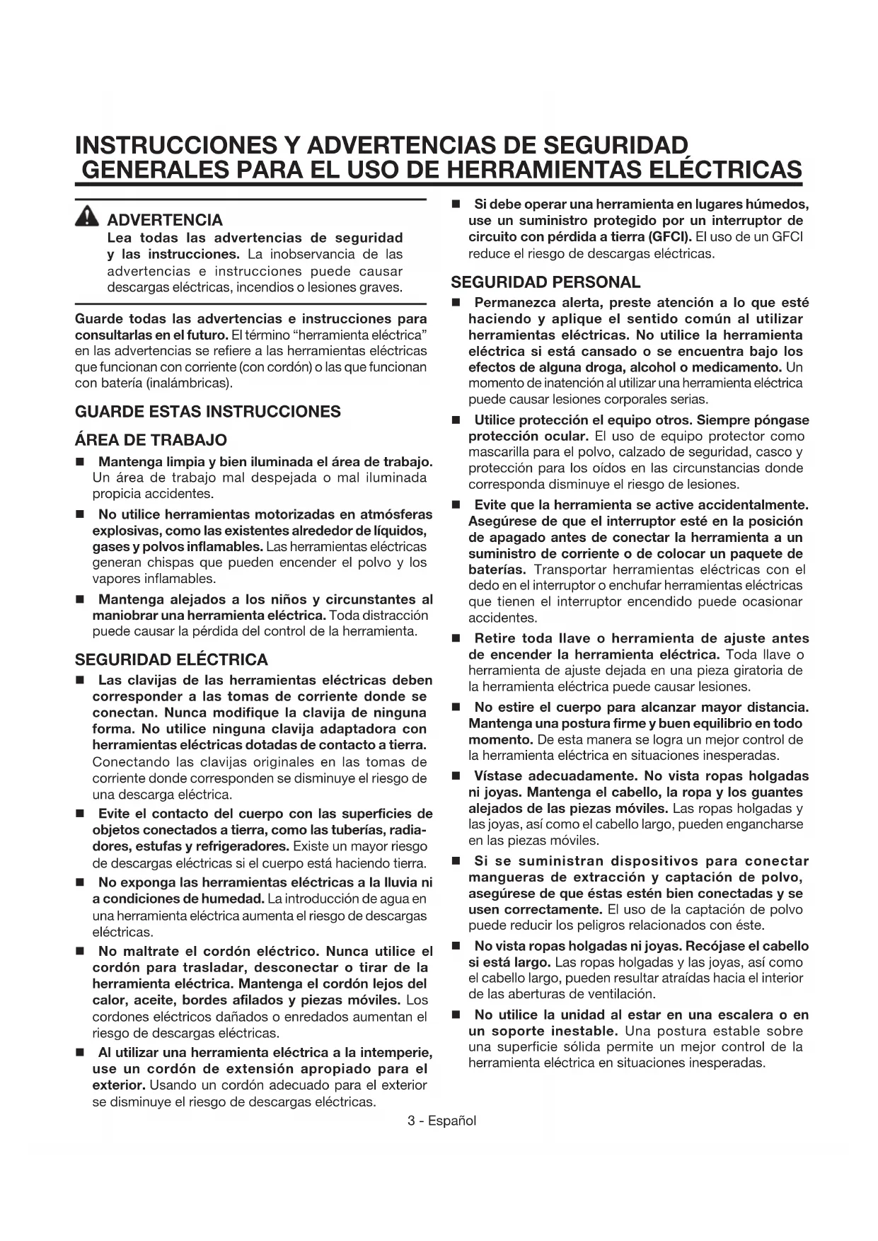 GENERALES PARA EL USO DE HERRAMIENTAS ELÉCTRICAS ADVERTENCIA Lea todas las advertencias de seguridad y las instrucciones. La inobservancia de las advertencias e instrucciones puede causar descargas eléctricas, incendios o lesiones graves. Guarde todas las advertencias e instrucciones para consultarlas en el futuro. El término “herramienta eléctrica” en las advertencias se refiere a las herramientas eléctricas que funcionan con corriente (con cordón) o las que funcionan con batería (inalámbricas).