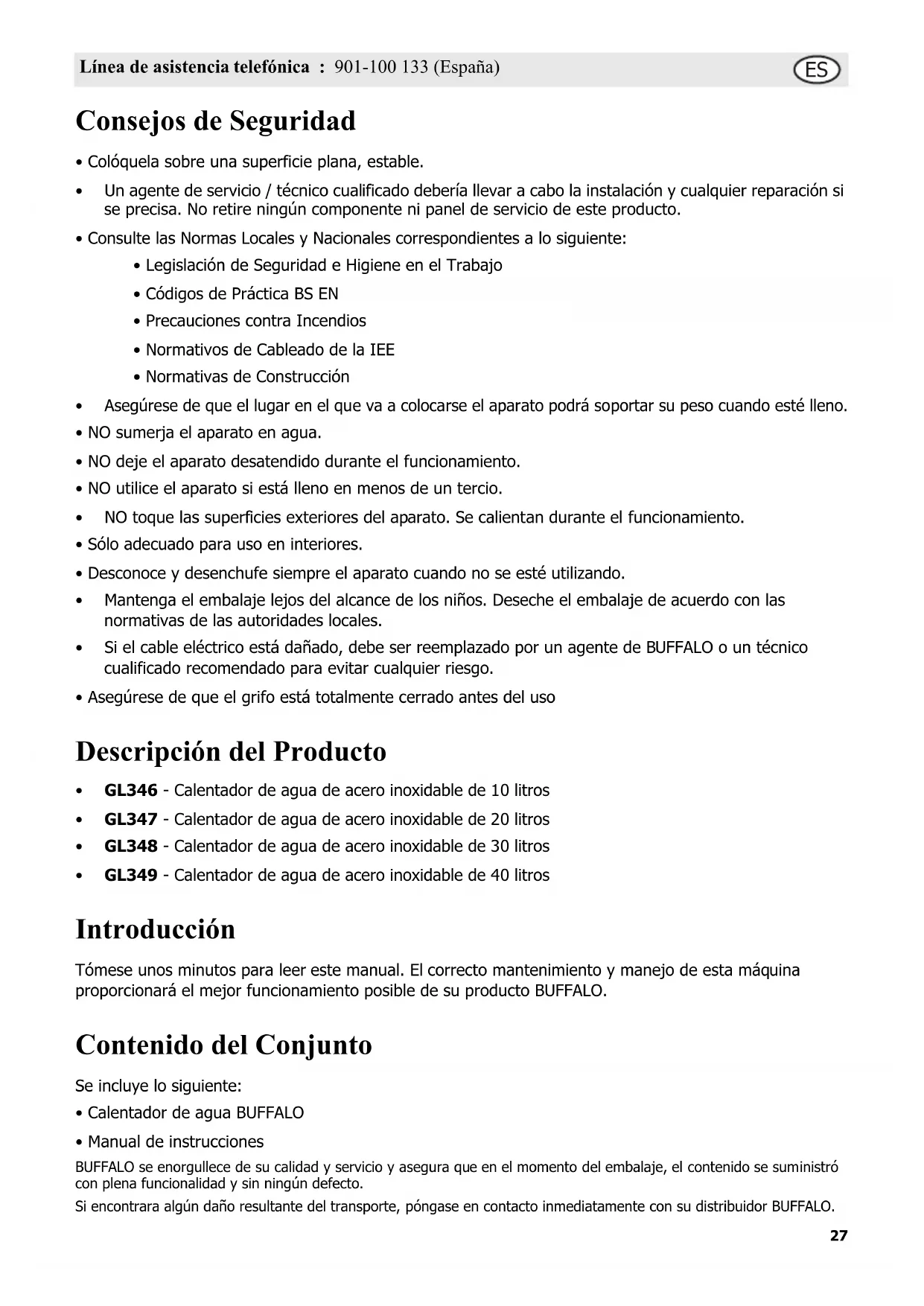 - GL349 - Calentador de agua de acero inoxidable de 40 litros Introducción Tómese unos minutos para leer este manual. El correcto mantenimiento y manejo de esta máquina proporcionará el mejor funcionamiento posible de su producto BUFFALO. Contenido del Conjunto Se incluye lo siguiente: