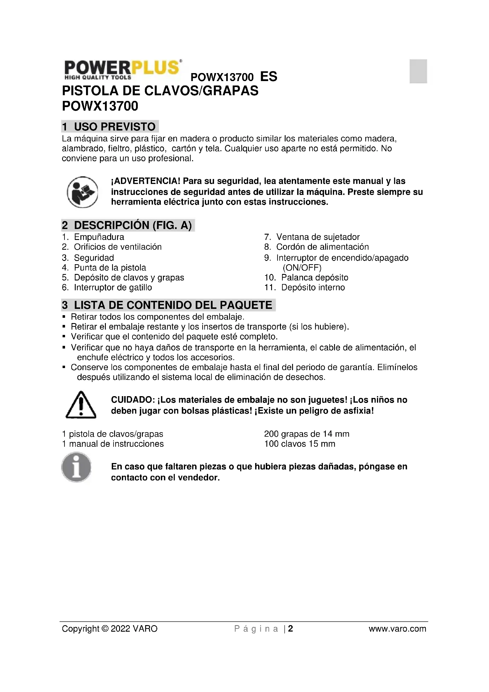 POWX13700 1 USO PREVISTO La máquina sirve para fijar en madera o producto similar los materiales como madera, alambrado, fieltro, plástico, cartón y tela. Cualquier uso aparte no está permitido. No conviene para un uso profesional. ¡ADVERTENCIA! Para su seguridad, lea atentamente este manual y las instrucciones de seguridad antes de utilizar la máquina. Preste siempre su herramienta eléctrica junto con estas instrucciones. 2 DESCRIPCIÓN (FIG. A)