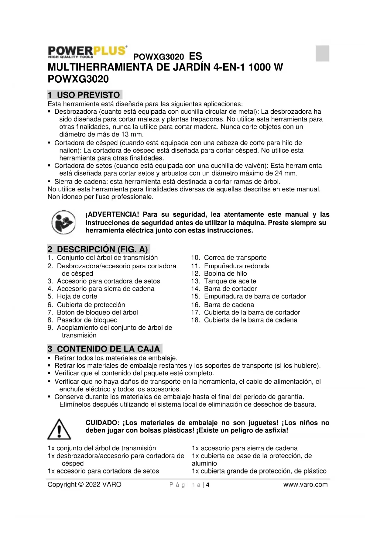 - Conserve durante los materiales de embalaje hasta el final del periodo de garantía. Elimínelos después utilizando el sistema local de eliminación de desechos de basura. CUIDADO: ¡Los materiales de embalaje no son juguetes! ¡Los niños no deben jugar con bolsas plásticas! ¡Existe un peligro de asfixia! 1x conjunto del árbol de transmisión 1x desbrozadora/accesorio para cortadora de césped 1x accesorio para cortadora de setos 1x accesorio para sierra de cadena 1x cubierta de base de la protección, de aluminio 1x cubierta grande de protección, de plásticoPOWXG3020 ES Copyright © 2022 VARO P á g i n a | 5 www.varo.com 1x empuñadura de redonda 1x correa de transporte 1x bobina de hilo 1x hoja de corte 1x llave hexagonal (en empuñadura redonda) 1x llave multiusos (en cubierta de barra de cadena) 1x llave de 14 mm 1x cadena de 8" 1x barra de cadena de 8" 1x cubierta de la barra de cadena 1x cubierta de la barra de cortador 1x tuerca de 14 mm 1x arandela negra 1x manual En caso de que falten piezas o que hayan piezas dañadas, ponerse en contacto con el vendedor. 4 SÍMBOLOS En este manual y/o en el aparato mismo se utilizan los siguientes símbolos: