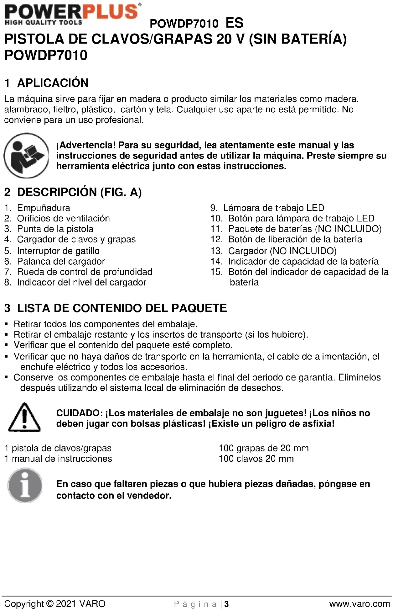 Copyright © 2021 VARO P á g i n a | 3 www.varo.com PISTOLA DE CLAVOS/GRAPAS 20 V (SIN BATERÍA) POWDP7010 1 APLICACIÓN La máquina sirve para fijar en madera o producto similar los materiales como madera, alambrado, fieltro, plástico, cartón y tela. Cualquier uso aparte no está permitido. No conviene para un uso profesional. ¡Advertencia! Para su seguridad, lea atentamente este manual y las instrucciones de seguridad antes de utilizar la máquina. Preste siempre su herramienta eléctrica junto con estas instrucciones. 2 DESCRIPCIÓN (FIG. A)