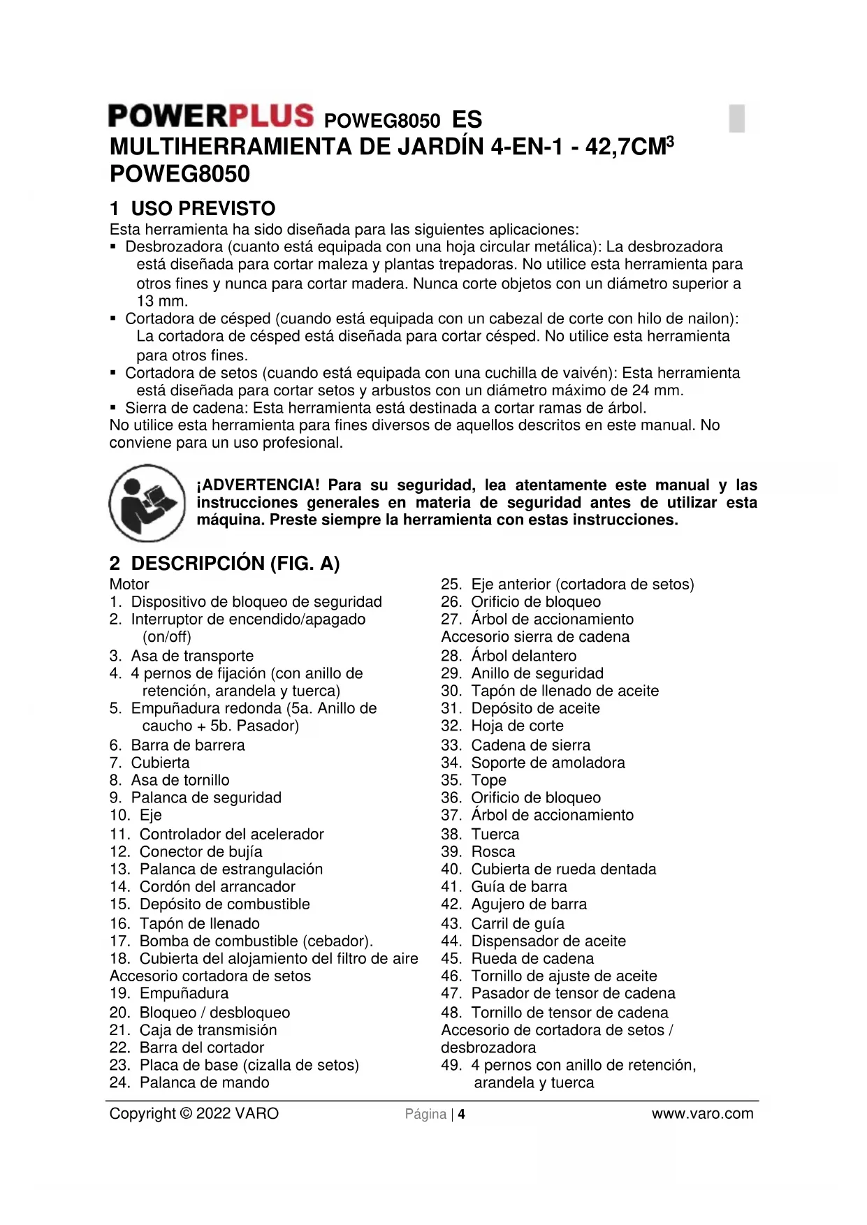 - Asegúrese de que durante el almacenamiento no haya residuos de corte en el dispositivo de protección (50), la desbrozadora (52) y el motor.POWEG8050 ES Copyright © 2022 VARO Página | 24 www.varo.com